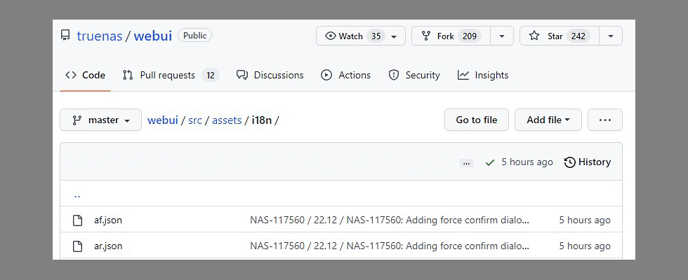 デフォルトでは、TrueNASは英語で利用可能です。しかし、ユーザーはTrueNASウェブインターフェースのテキスト文字列翻訳に貢献し、TrueNASを他の多くの言語で利用可能にするお手伝いができます!貢献にはGitHubアカウントと、英語テキストを他の言語に翻訳する能力が必要です。TrueNAS ウェブインターフェースを翻訳するには、GitHub にサインインし、TrueNAS webui リポジトリに移動します。適切な翻訳ファイルを見つけ、編集し、翻訳内容を含むプルリクエストをプロジェクトに送信します。詳細な手順については、この記事の残りの部分をご覧ください。