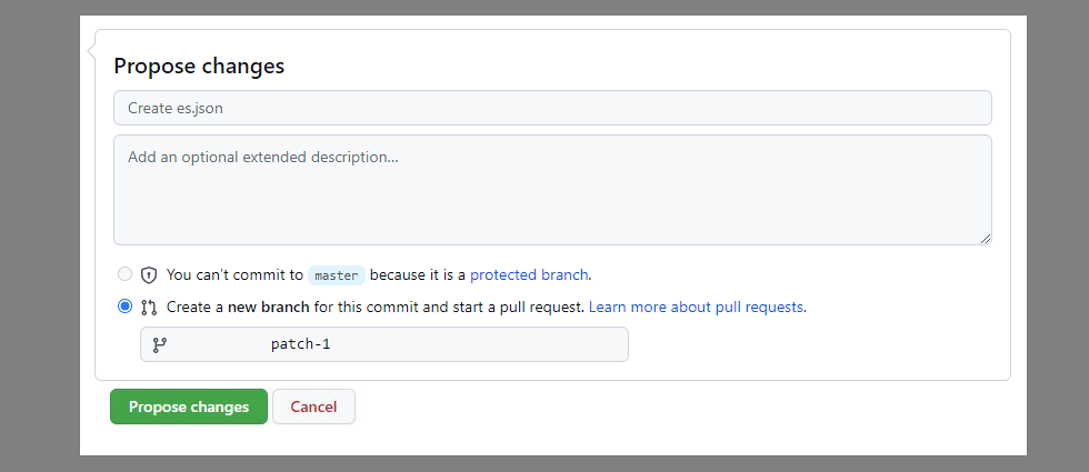 翻訳が必要な英語の文字列が二重引用符で囲まれて最初に表示されます。その後ろにコロン、さらに二重引用符が続きます。翻訳文は二重引用符のペアの間に記入してください。「Preview changes(変更をプレビュー)」タブをクリックすると、変更内容をリアルタイムで確認できます。変更を保存しない場合は「Cancel changes(変更をキャンセル)」をクリックしてください。新しいプルリクエストを開始する