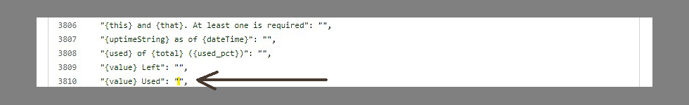 ファイルの最終行から順に編集を進めてください。ファイル末尾から開始し、翻訳が記載されているか確認します。翻訳が一切記載されていないファイルもあります。その場合はファイル末尾から編集を開始してください。 (訳注:右側の""内が空欄、未翻訳の文字列が前にアルファベット順、右側の""内が入力されている文字列が後にアルファベット順に並んでいます。プルリクエストがマージされた後に言語ファイルが更新されると未翻訳→翻訳済と並べ換えられ、先頭の方に未翻訳が集まっています。末尾から翻訳するとこの翻訳順の並べ換えに翻弄されずに済みますが、それだけなので、未翻訳の任意の行を部分的に翻訳してプルリクエストを送ることも可能です。また日本語の言語ファイルは現時点で一通り翻訳済みなので、先頭付近に新しく追加された文字列が現れる形になっています。そこだけ翻訳していけば追従できる感じですし、表示される状態で不適切な訳に気づいたら、そこだけ直してプルリクエストを送ってもいいでしょう)ファイルの最終行に翻訳が含まれている場合、上にスクロールしてください(降順)。言語翻訳がリストされていない、次に利用可能なコード行を探します。この地点から翻訳を開始してください。