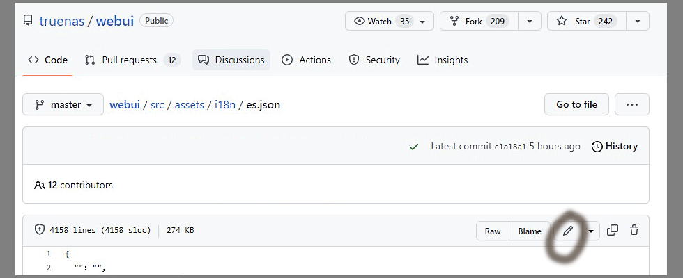 対象言語に対応する.jsonファイルを選択してください。2文字のISO 639-1コードに関する詳細は以下を参照:ISO 639-1 Codes。 (訳注:日本語は ja.json になります).jsonファイル名をクリック。ファイルがGitHubのウェブベースエディタで開きます。鉛筆アイコンをクリックして編集を開始してください。
