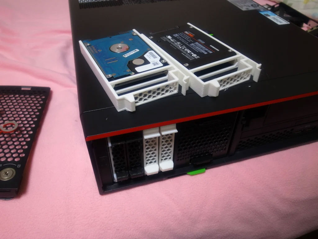 TrueNAS の次世代検証機用に Primergy TX1320 M4 を入手しましたが、2.5インチSATAマウンタにはEXOSドライブが装着されていて、余っているスロットに装着されているスペーサーはあくまでスペーサーなので、ディスクを装着するにはやはり3Dプリンターでマウンタを作るしかないか、と thingiverse で見つけたものをプリントしてみましたが、納得がいかないので、結局自分で作成しました。