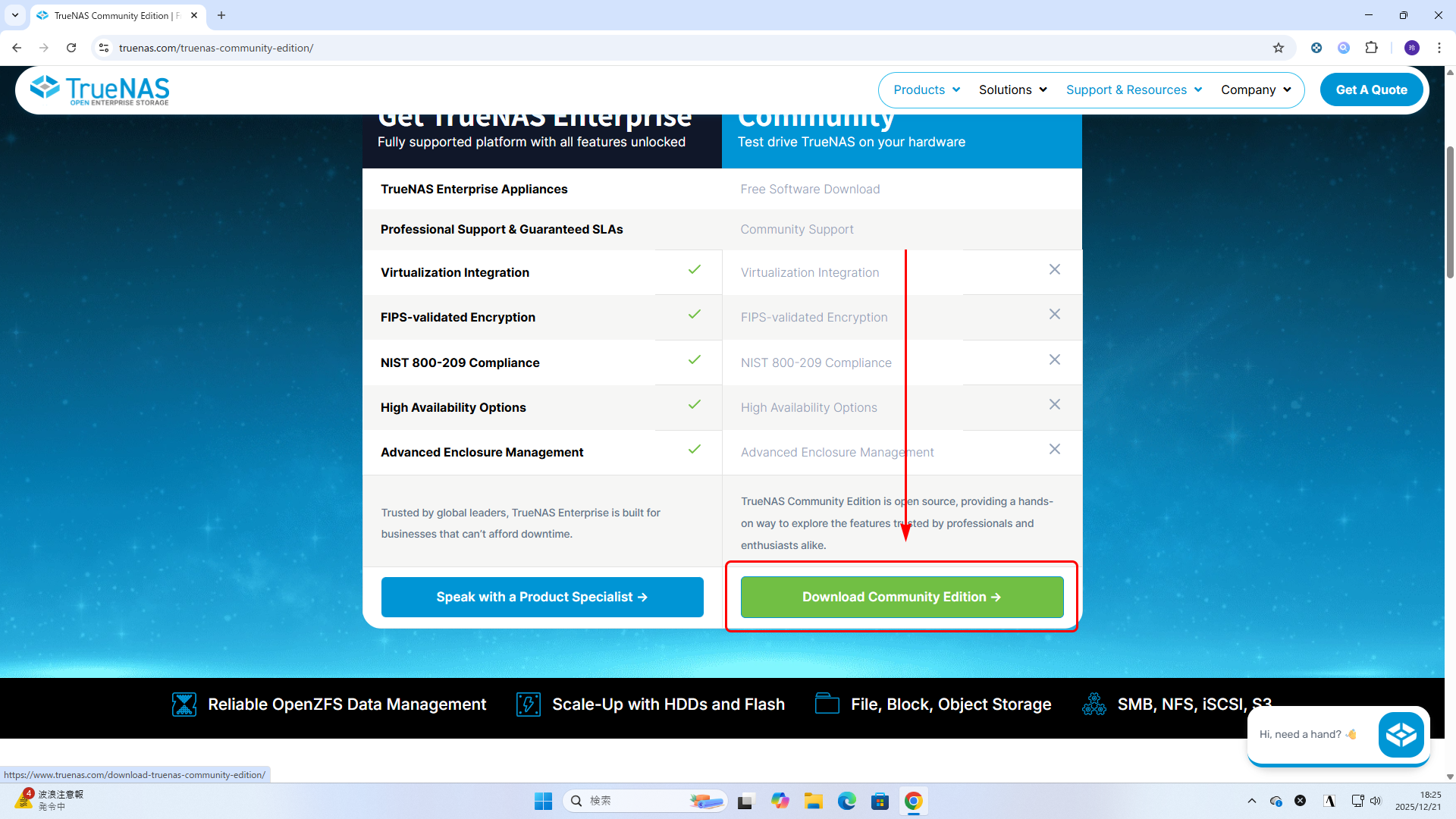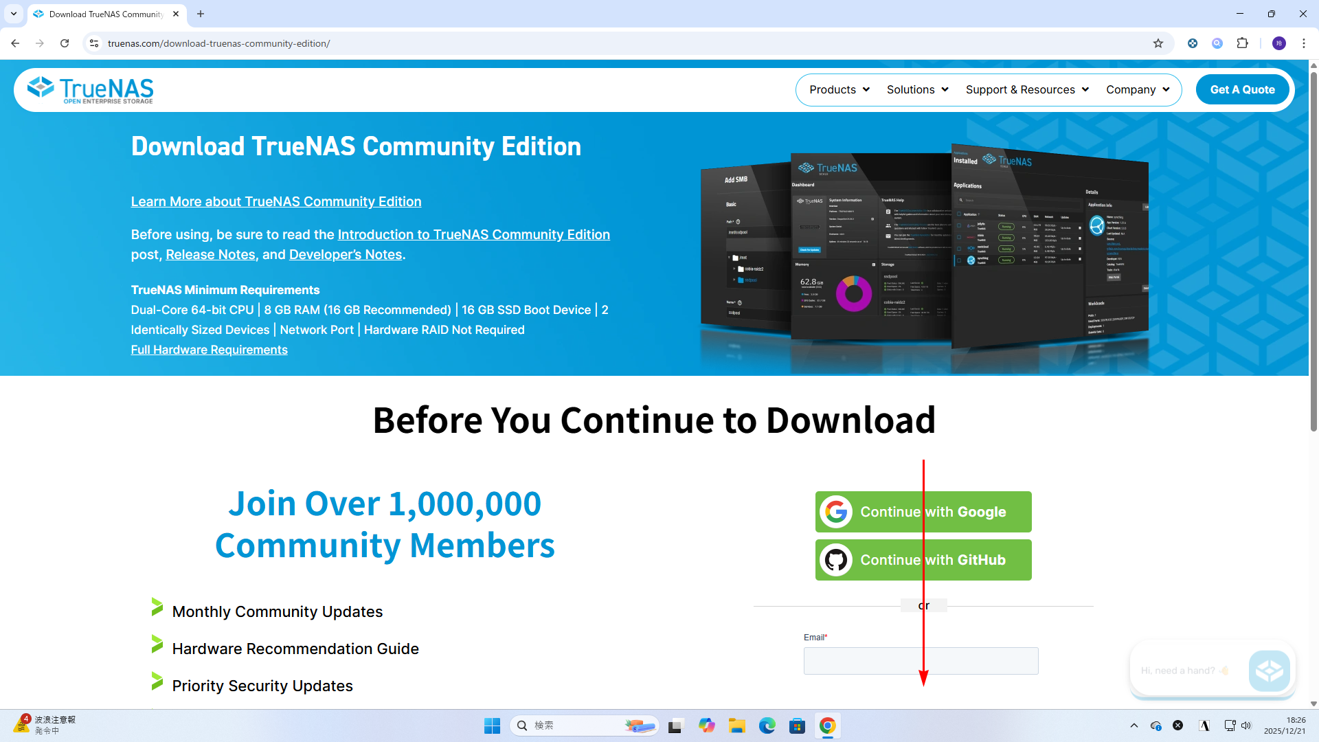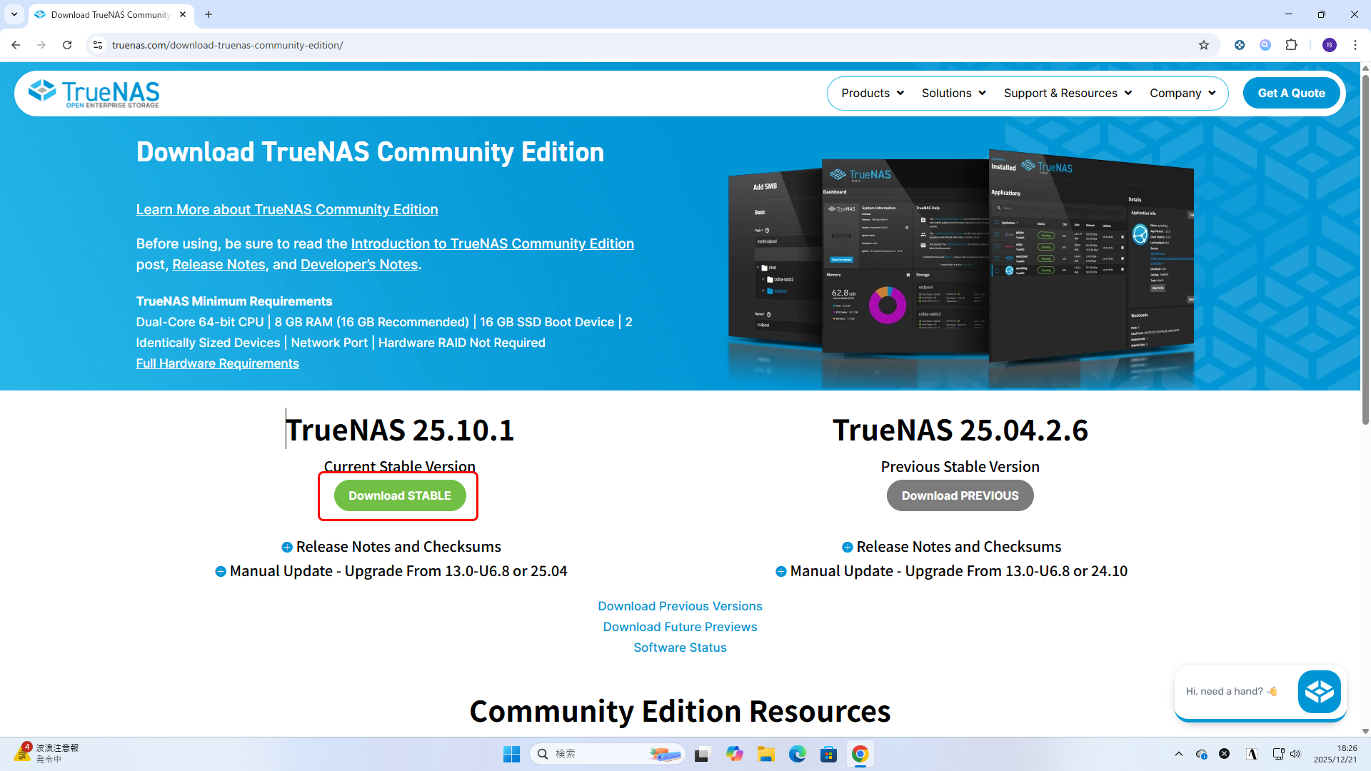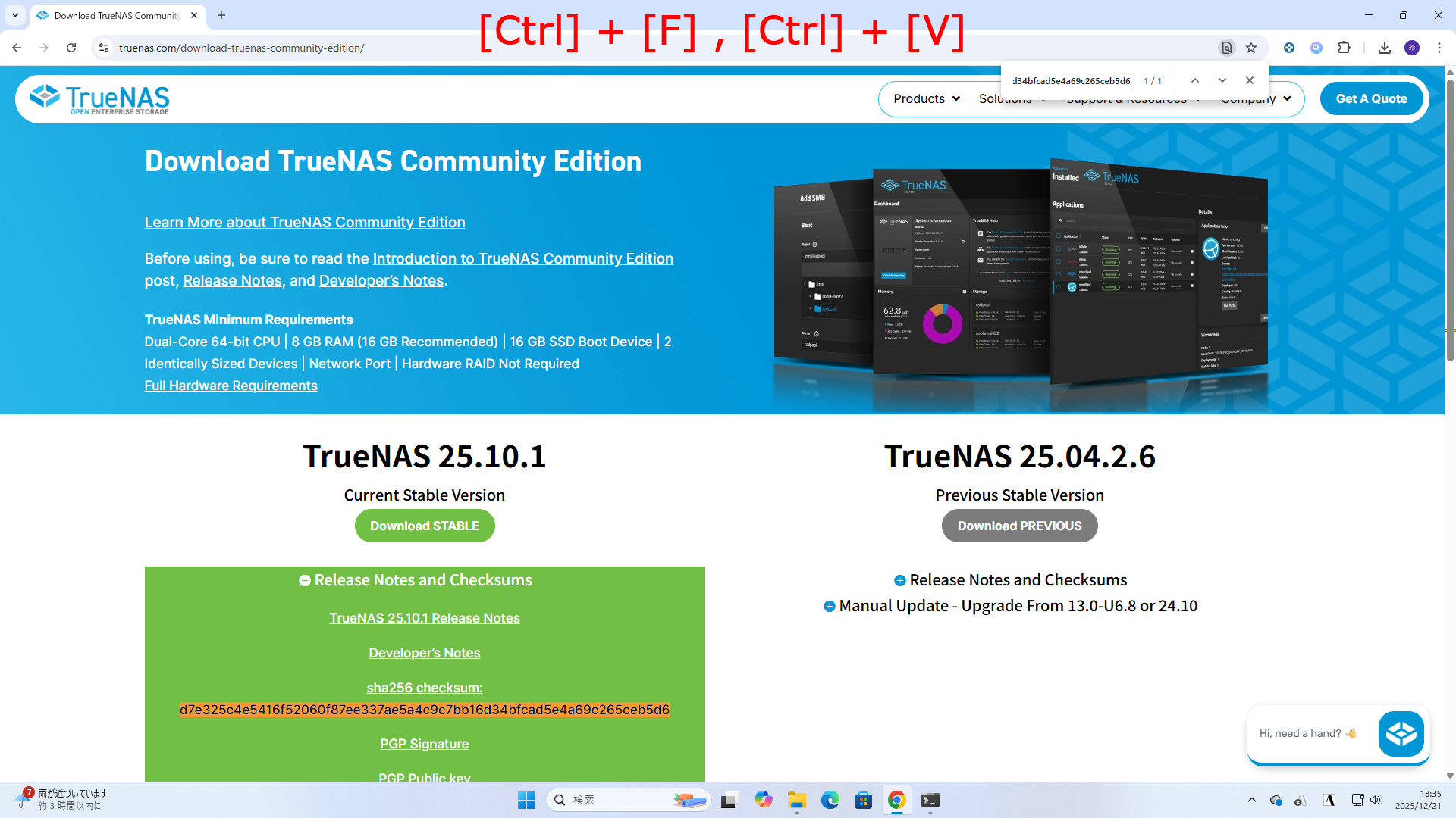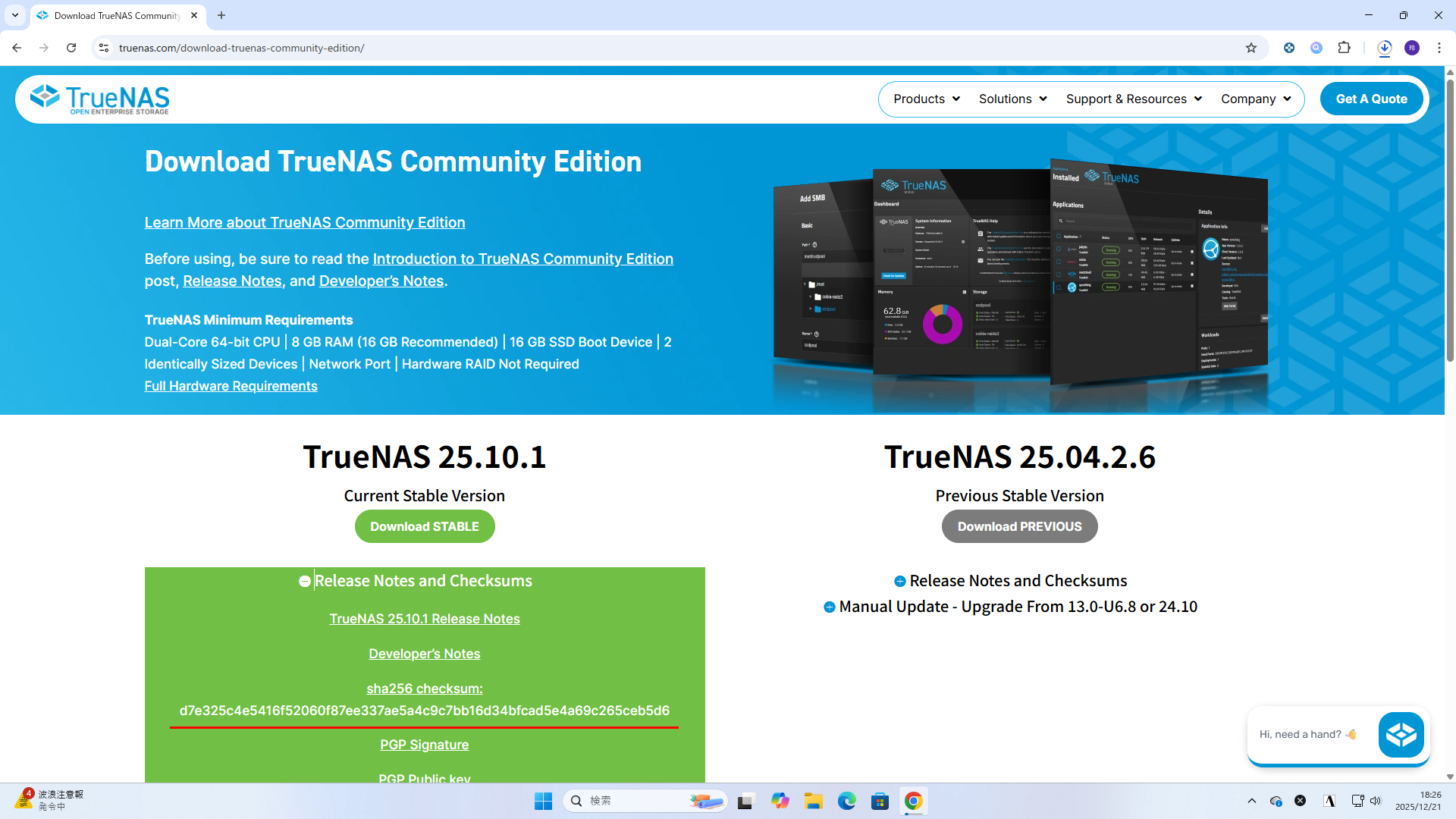 (右は現在は1つ前のトレインの TrueNAS SCALE 25.04.2.6 がダウンロードできますが、時期により新しいバージョンのBETAやRCなどが提供されたりします。それ以外のバージョンが必要な場合は下の Download Previous Versions 、 Download Future Previews などのリンク先から取得できます)