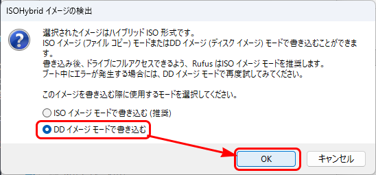 ということで、まずはISO イメージ モード推奨、ダメだったらDD イメージ モードを試してね、という書き方ですが、試してみたところ、