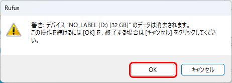 警告: デバイス"NO_LABEL (ディスク1) [32GB]"のデータは消去されます。