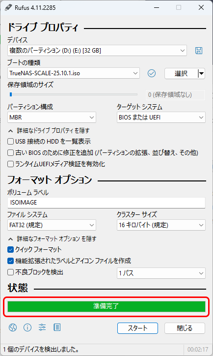 インストーラーを作成するUSBメモリをセットして Rufus を実行し、