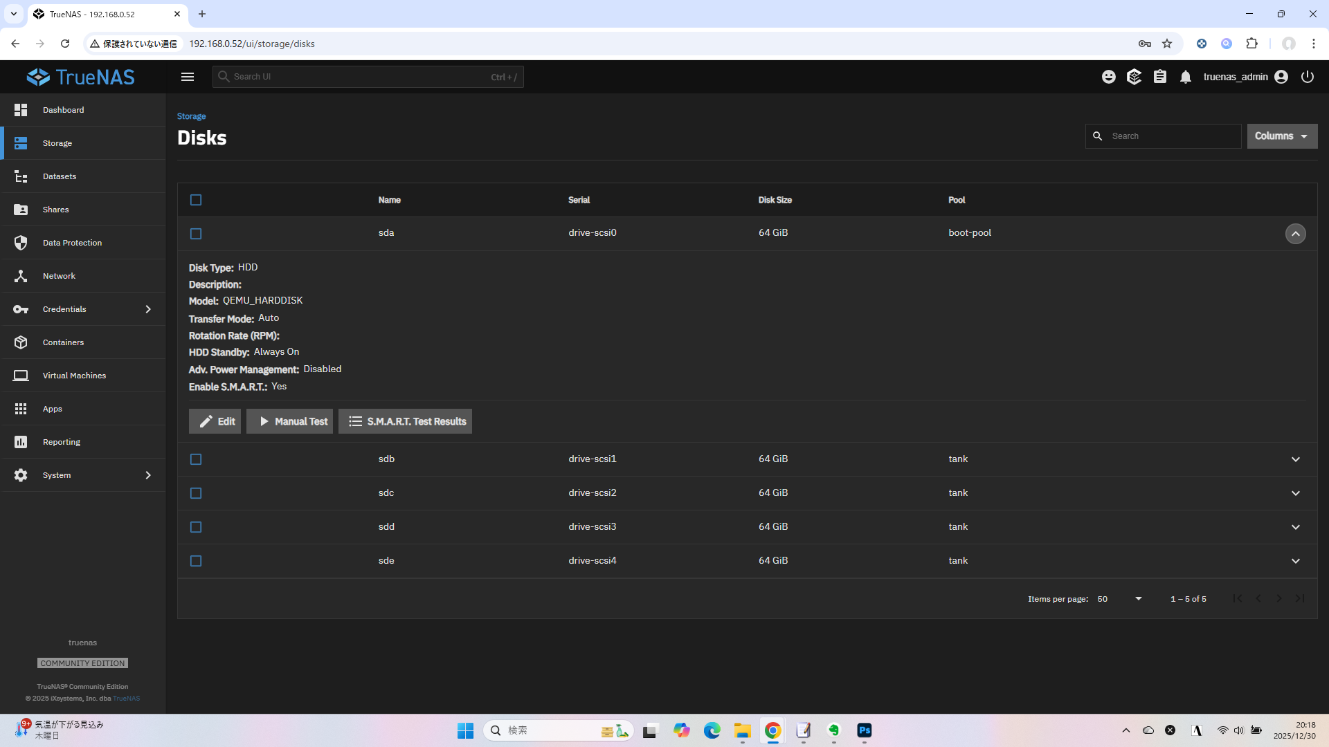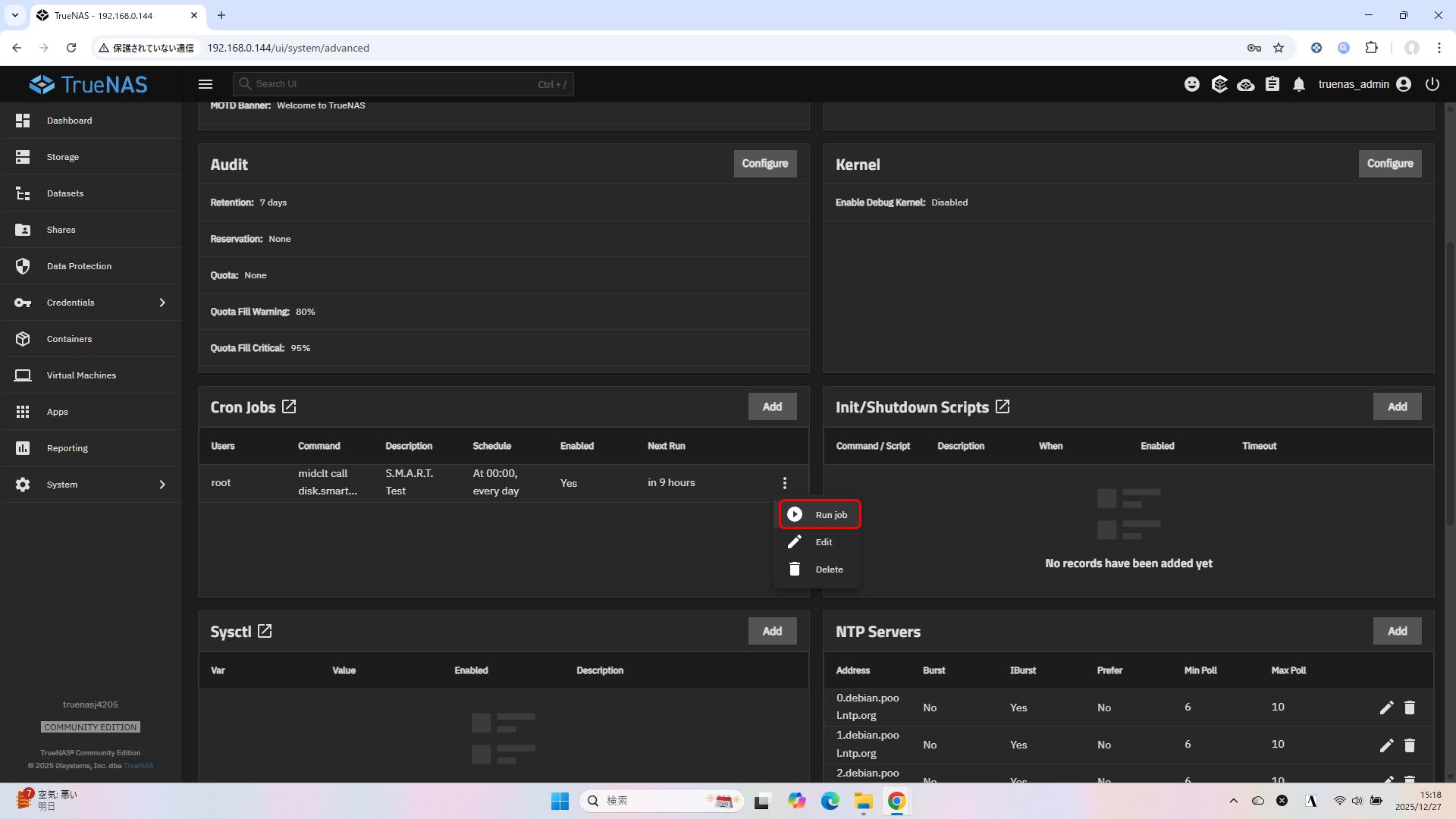 TrueNAS 25.10 で新規インストールした環境に S.M.A.R.T. テストを設定したいときに参考にしてください。