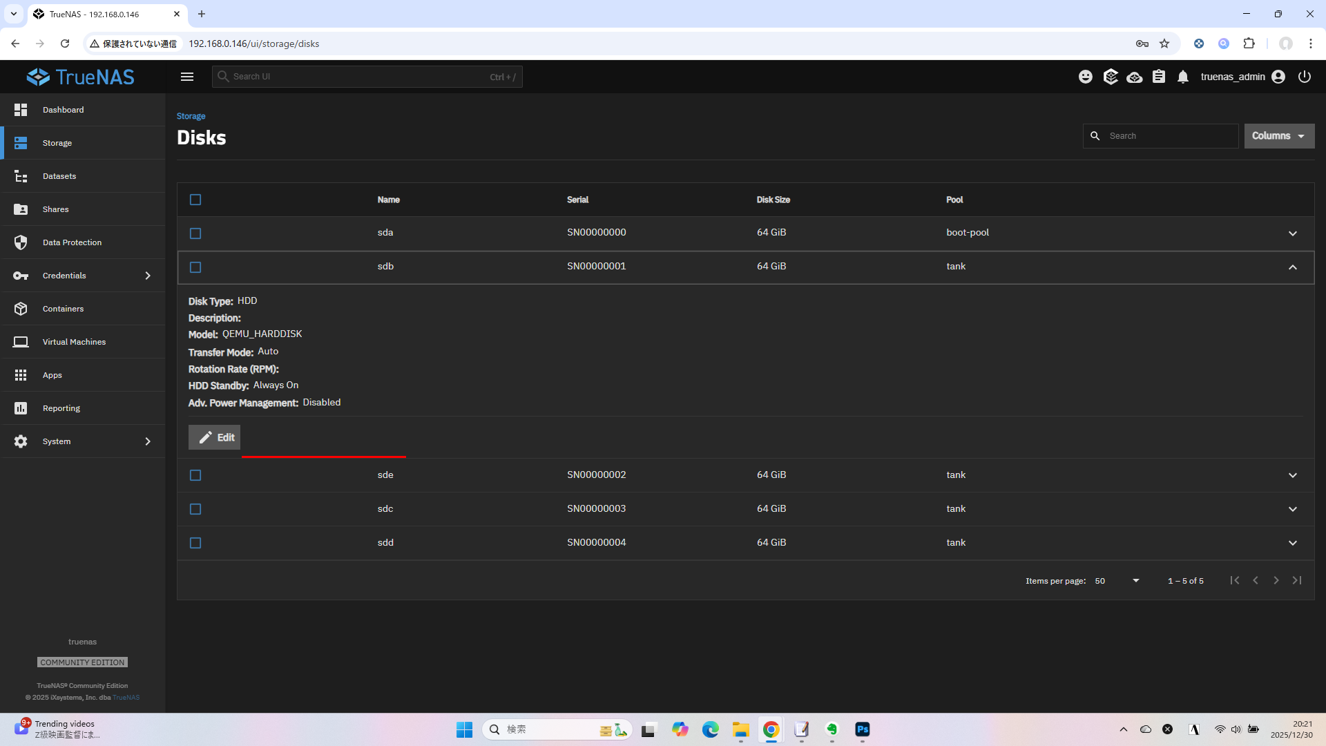 TrueNAS 25.04.2.6 では Disks の各ディスクを選択したときに、