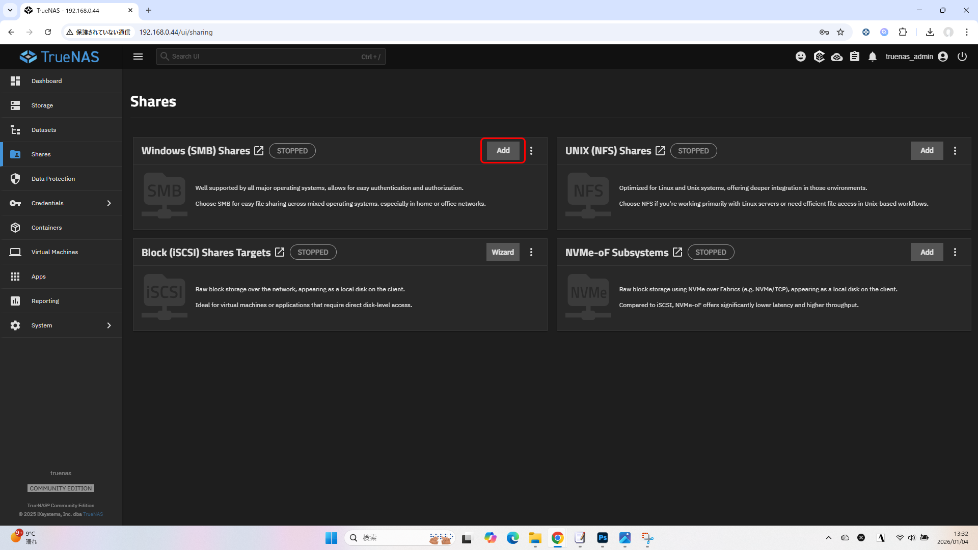 TrueNAS SCALE 25.10.1 のインストール・必要ならTrueNAS SCALE の CUI での固定IPアドレス設定を済ませたら、Web GUIベースでセットアップをしていきます。