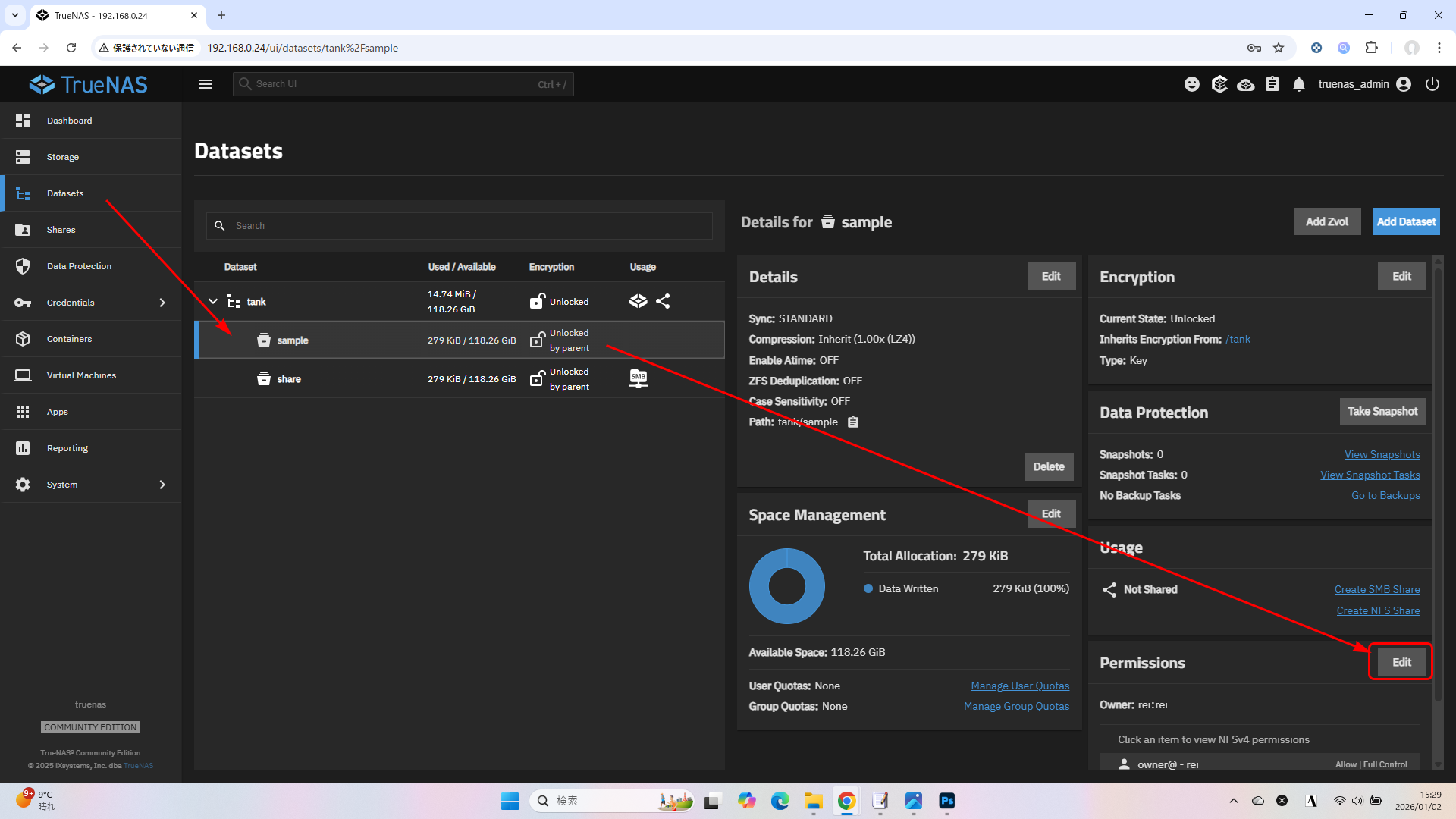 TrueNAS 上に作成したユーザーと、Windows で使用しているユーザーアカウントとが同一で、パスワードが一致していると、共有フォルダにアクセスするときにいちいち聞かれないので便利です。