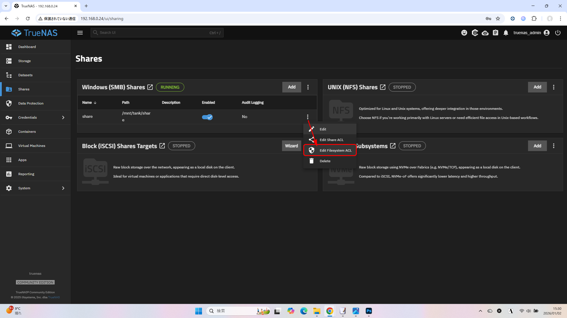対象の共有の右側の縦3点から盾型のアイコン Edit Filesystem ACL