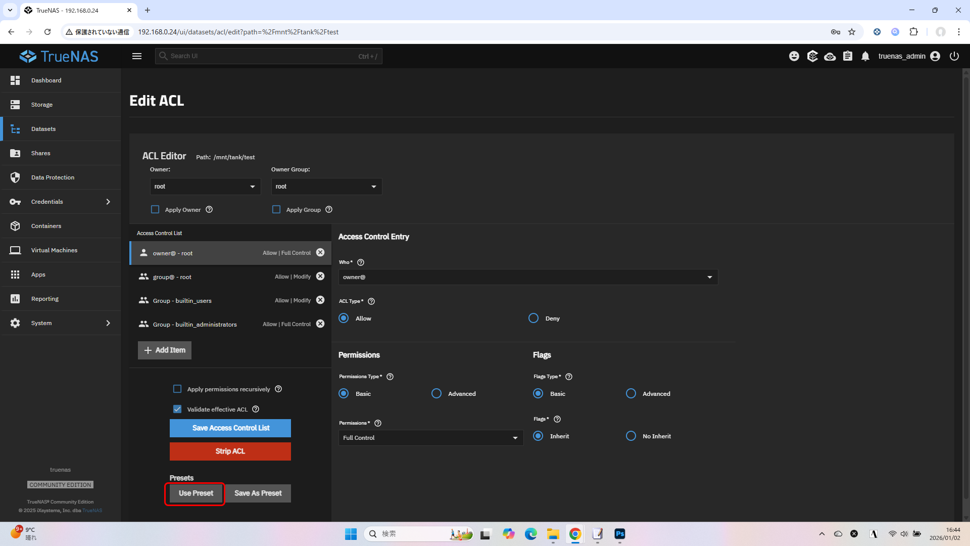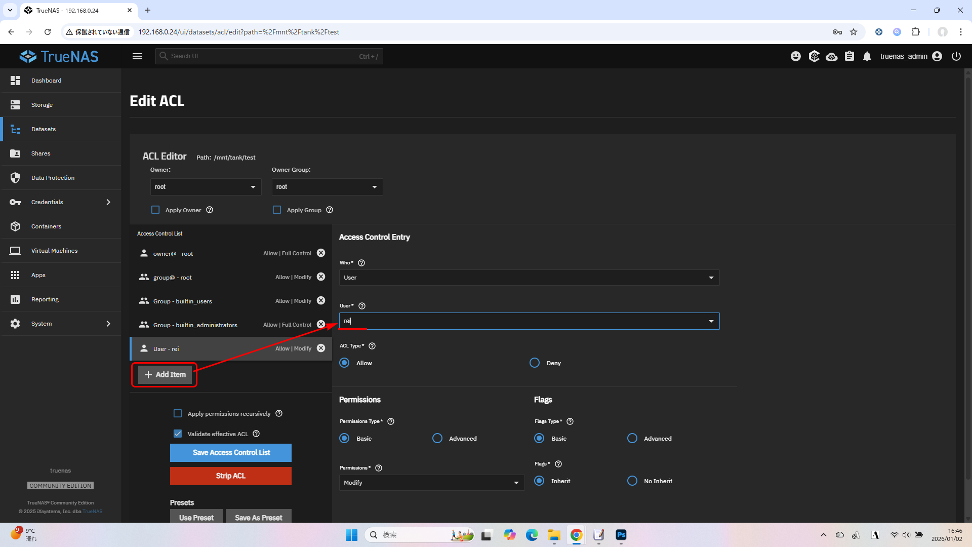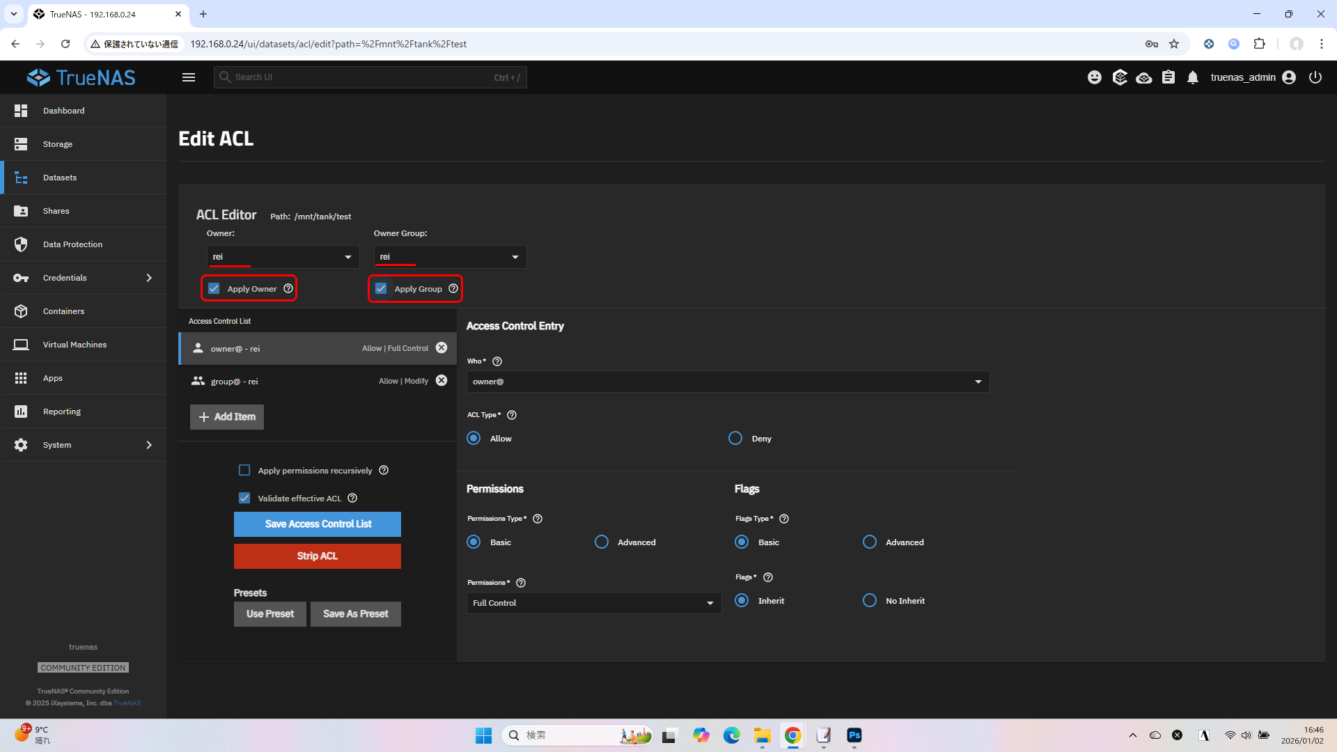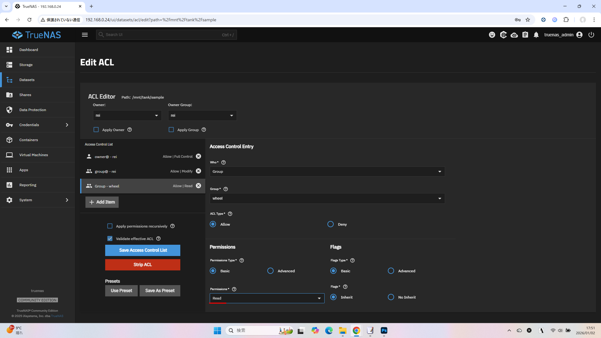 Linux 風のアクセス権コントロール(POSIX)だとユーザーとグループそれぞれ1つずつなので、融通が利かず必要に応じてアクセスコントロール用のグループを作成したりする運用が必要になりますが、 TrueNAS の ACL では、ユーザーやグループを複数設定できるので自由度が高くなっています。