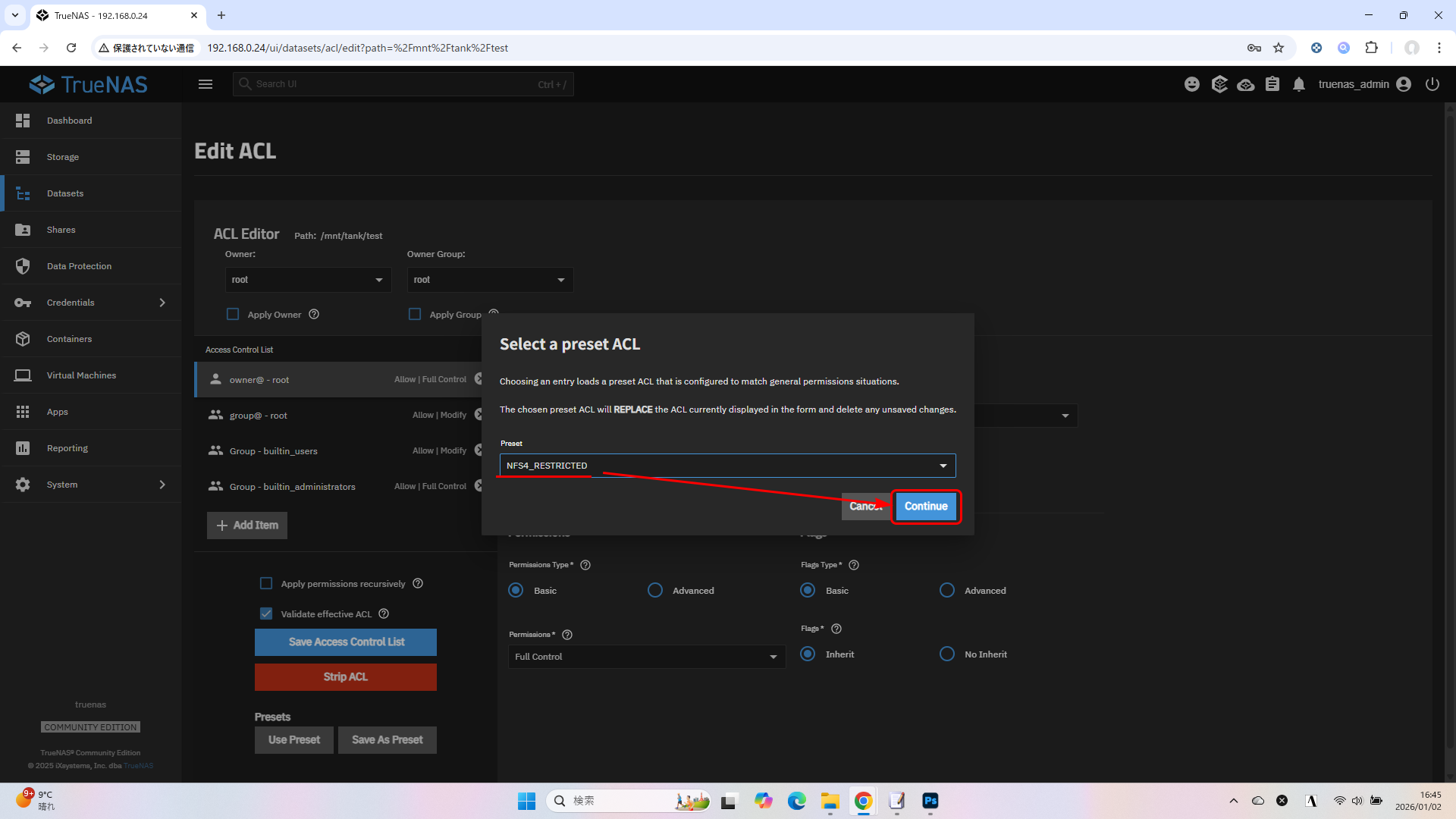 Dataset を SMB用で作成すると基本的に ACL で運用する設定になります。画面の様子を見てる感じでは Strip ACLs を実行したり、 Dataset を General で作成すると旧来の Linux 風のアクセス権コントロールになるみたいです。既存のデータセットで General で作成している場合、 Dataset の Edit で Advanced Options のところに ACL Type という項目があり、 Inherit(継承)とかになっているので、SMB/NTFSv4 に変更することで変えることもできます。なお SMB/NTFSv4 から POSIX に変更するときはアクセス権は変換されないらしいですが、どちらにしても、ACL Type を変更したら適切なアクセス権を Recursively (再帰的)に再度設定し直すべきということのようです。