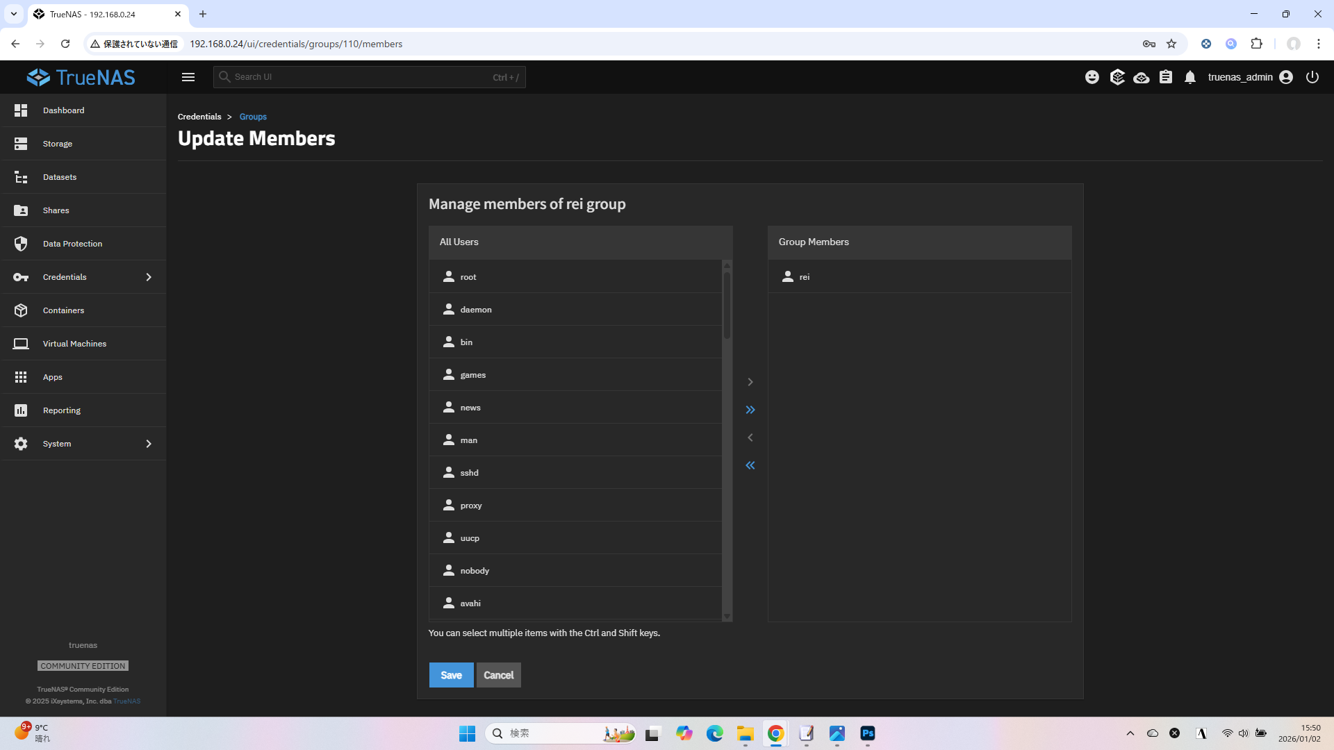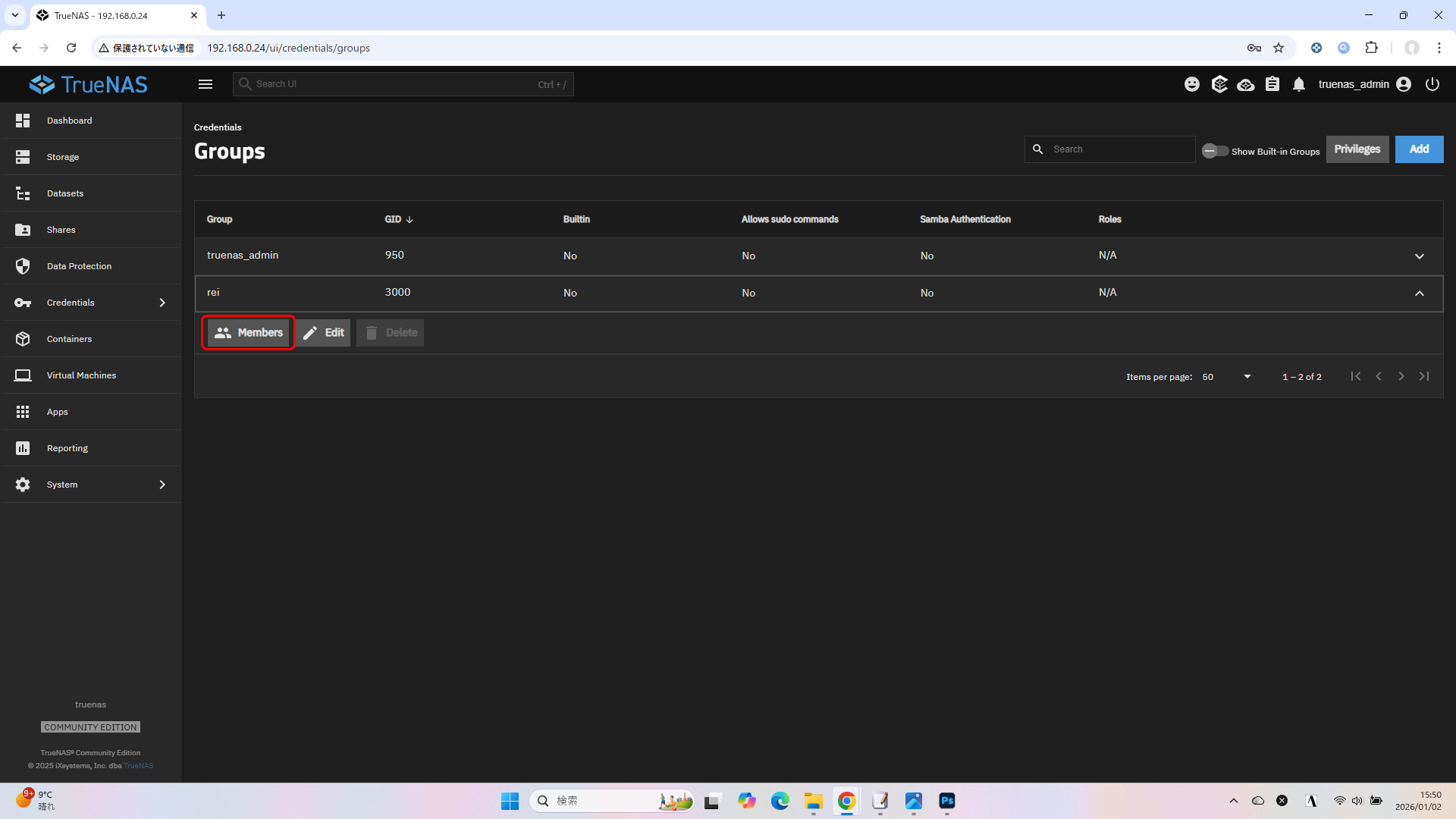 TrueNAS は Credentials のところでユーザーを作成したり、グループを作成したりできます。