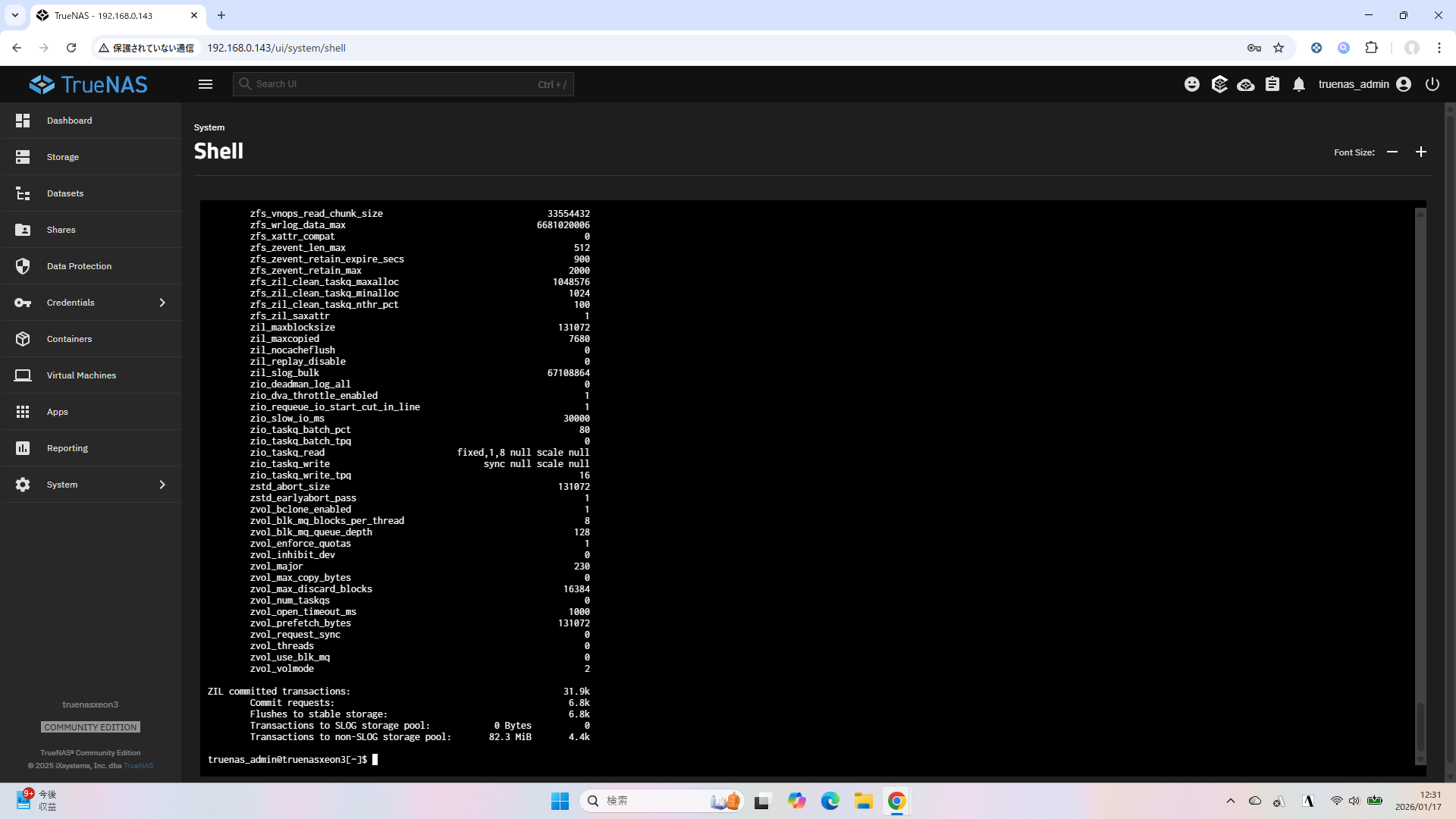画面のTrueNASは32GBのメモリ搭載でまだ5.7GBしかキャッシュを確保しておらず、22.6GBもFreeのままにしているので現状では余裕いっぱい、という感じです。