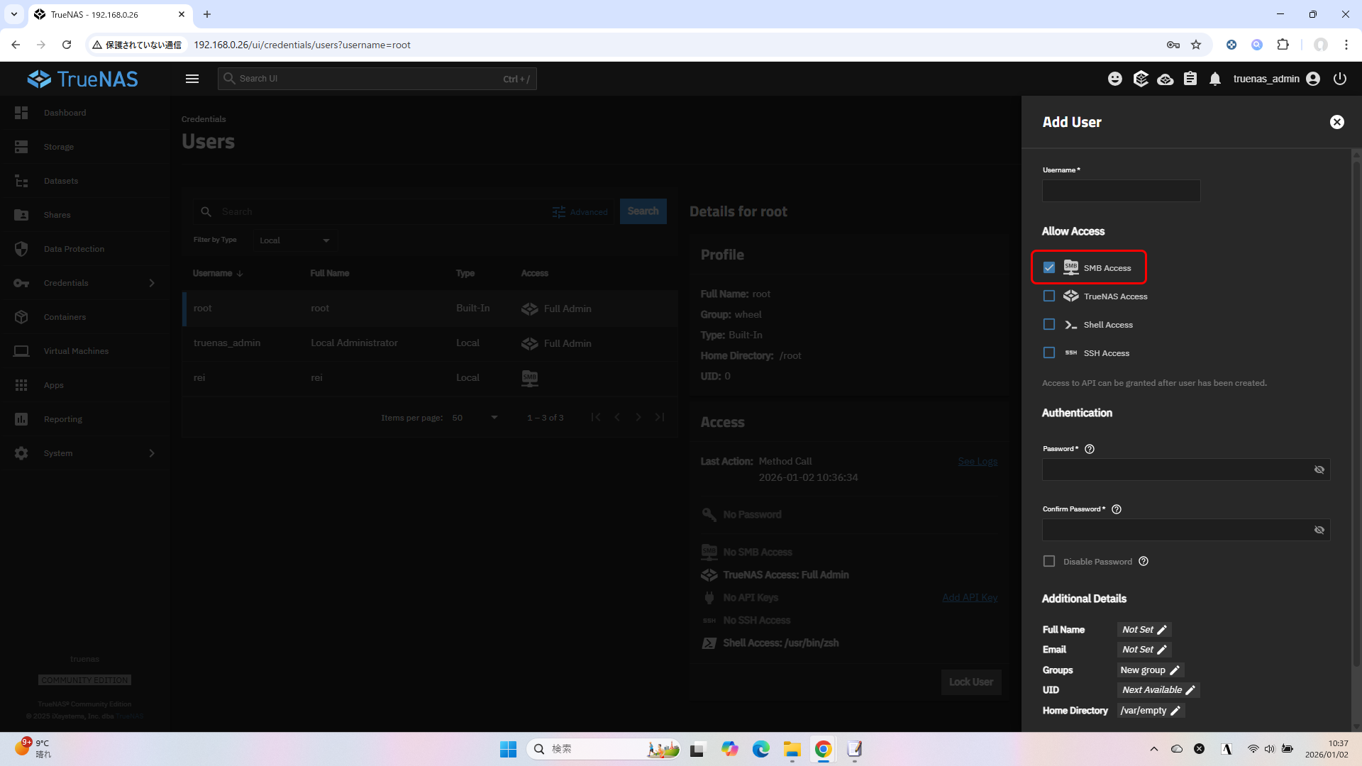 これにチェックが入っていないと、SMB共有にアクセスできません。デフォルトでチェックされていますのでわざわざ外すのは意図があってのことと思いますが、管理者ユーザーの root / admin / truenas_admin ではチェックされていませんので、古いドキュメントで古いバージョンで設定してこれらのユーザーで資格情報を登録した人は注意が必要です。SMBアクセス用の一般ユーザーを作成して使うようにしましょう。