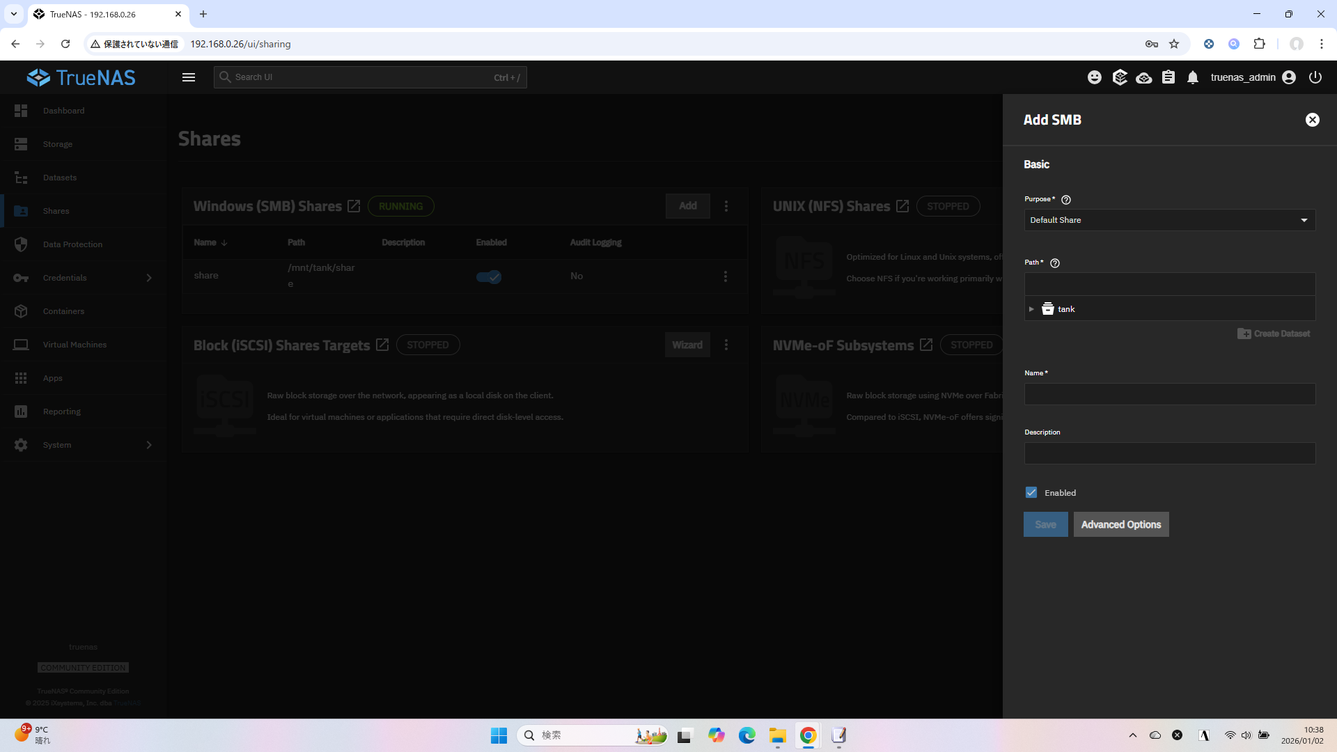 - Multi-Protocol Share: 全く同じデータセットに対して、Windows機からはSMBで、LinuxサーバーからはNFSで同時に読み書きさせたい場合。本当に必要な場合以外は避け、SMBまたはNFSのどちらかに統一するほうがトラブルが少ないです。