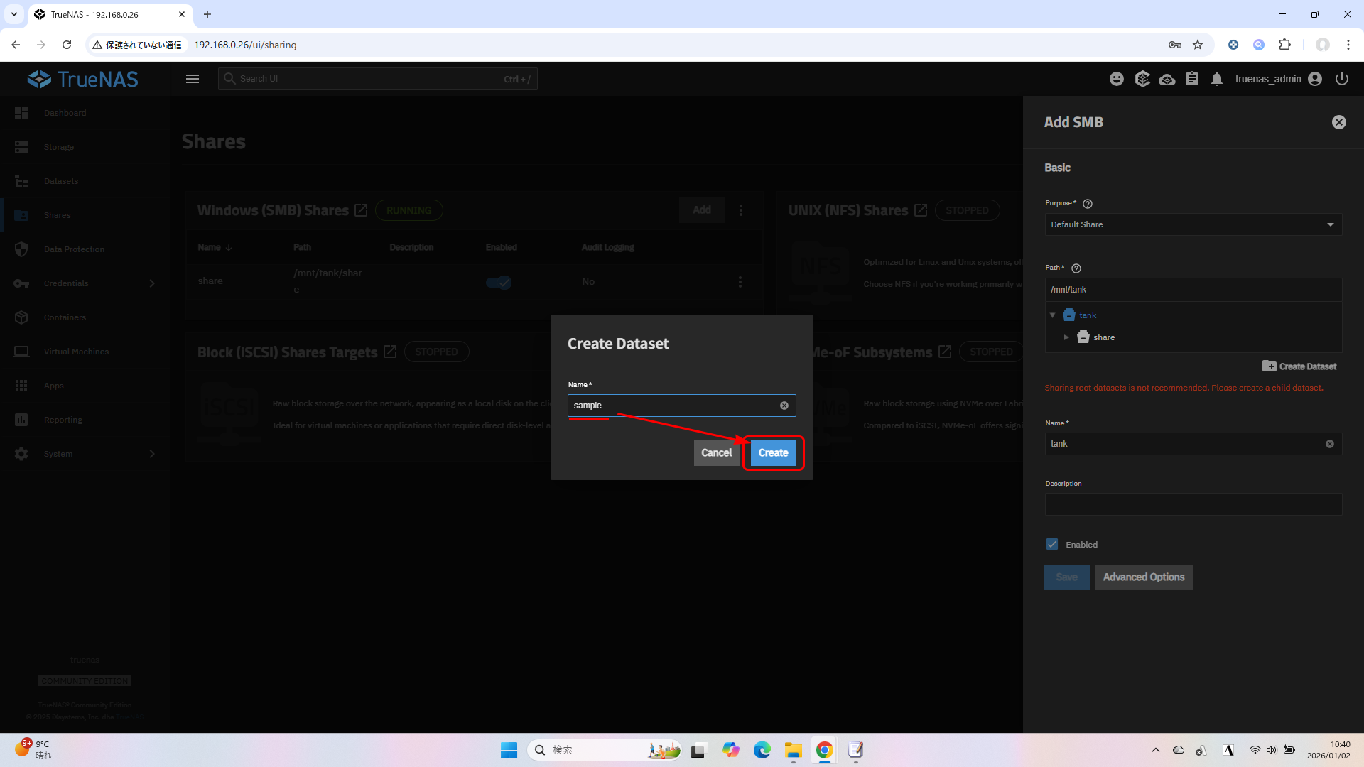 2. SMB共有とデータセットの作成