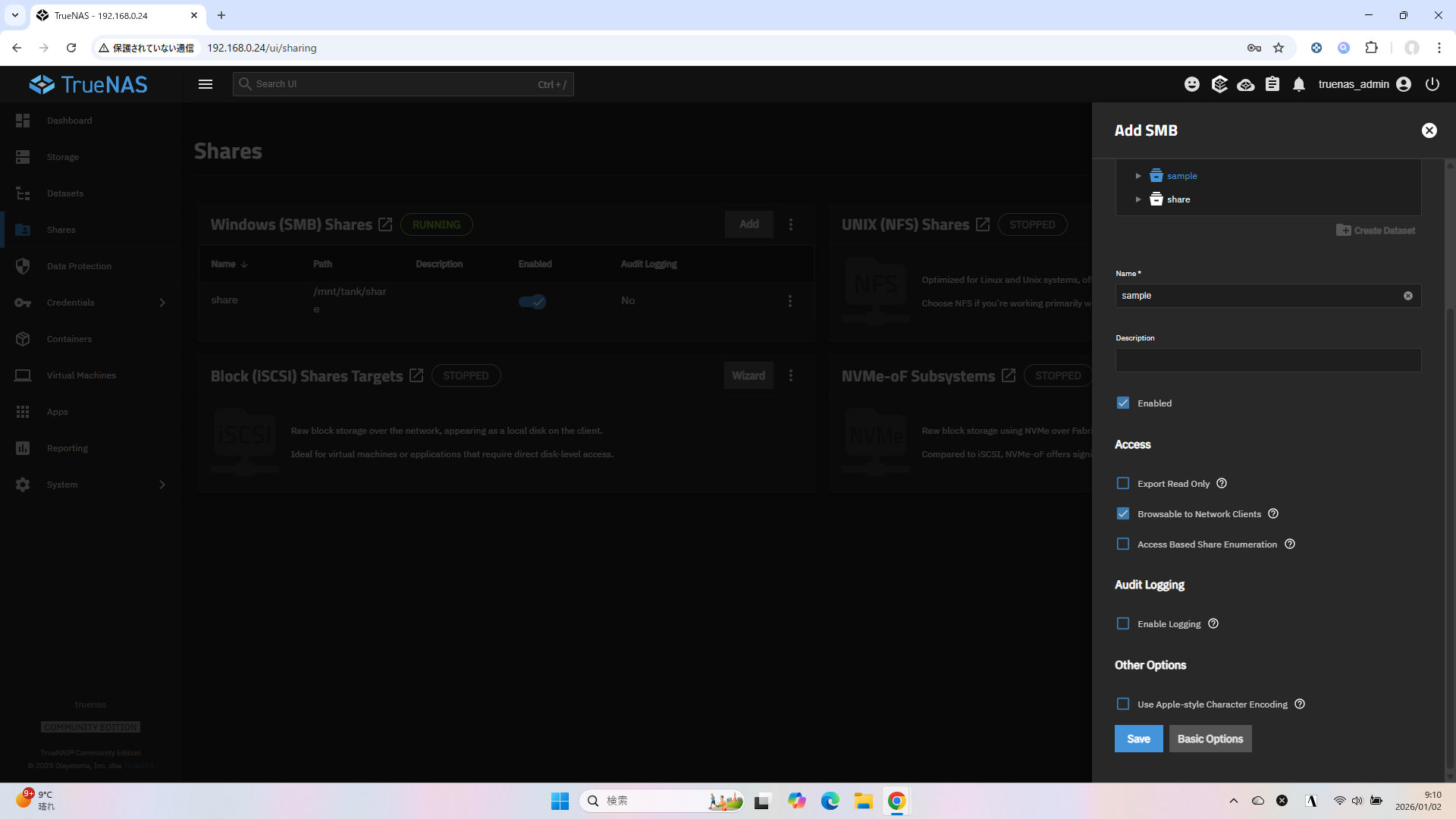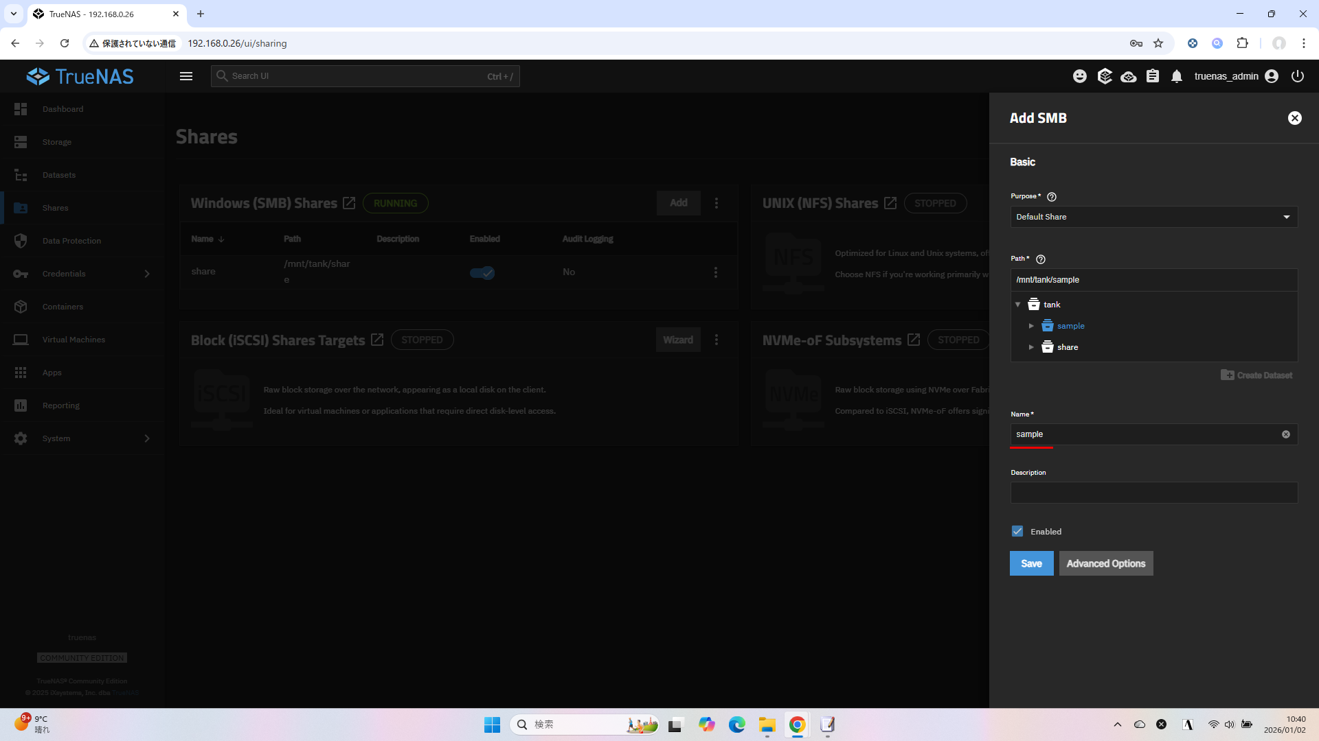 TrueNAS 25.10.1 ベースで、Windows から TrueNAS の共有フォルダを利用できるようにする設定方法です。