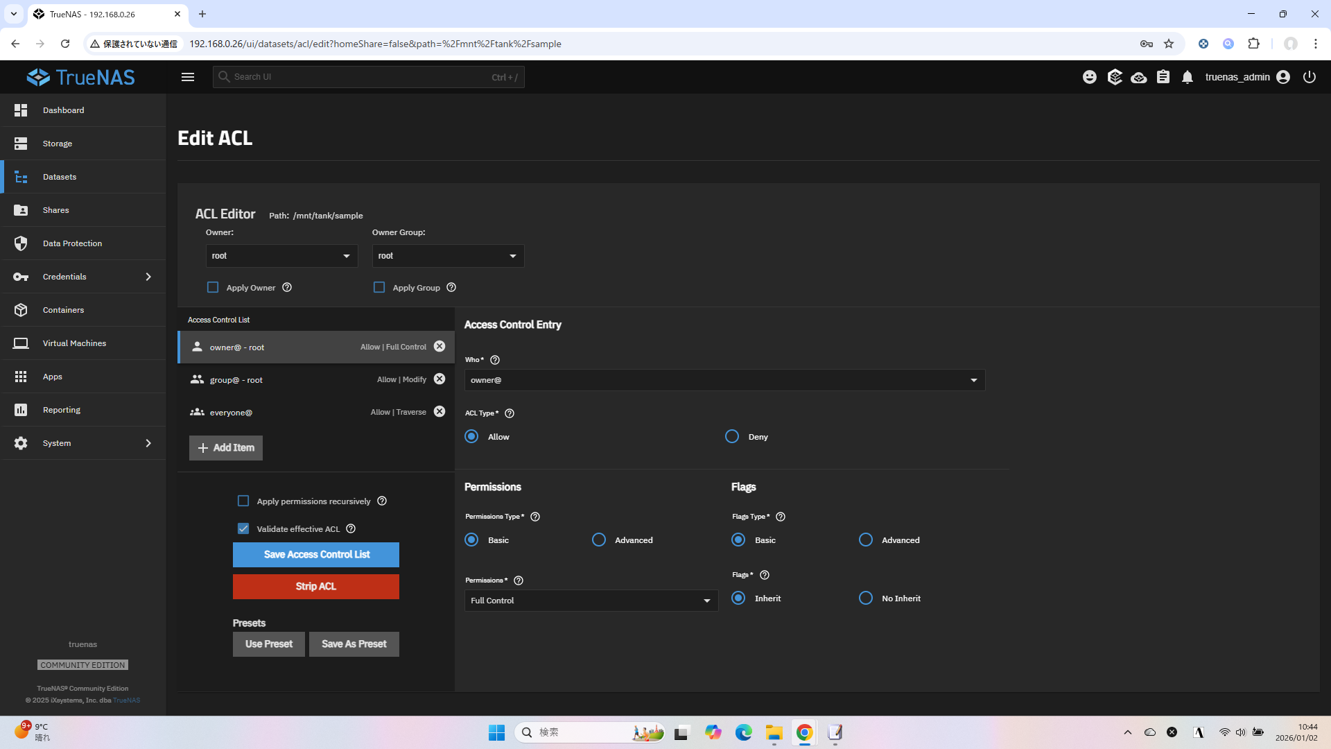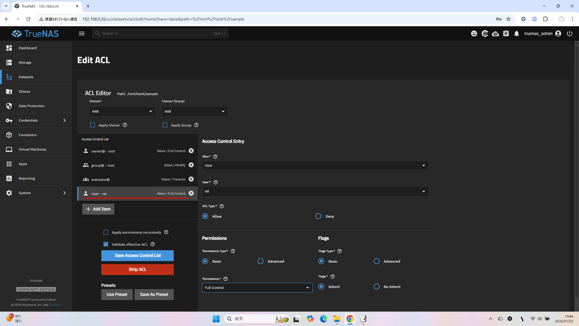 これで、指定したユーザーのみ(厳密にはrootや他の管理者、TrueNAS上の他のユーザーにはアクセス権がありますが、そのあたりは後述)がフルコントロール権限を持つ共有フォルダが完成しました。