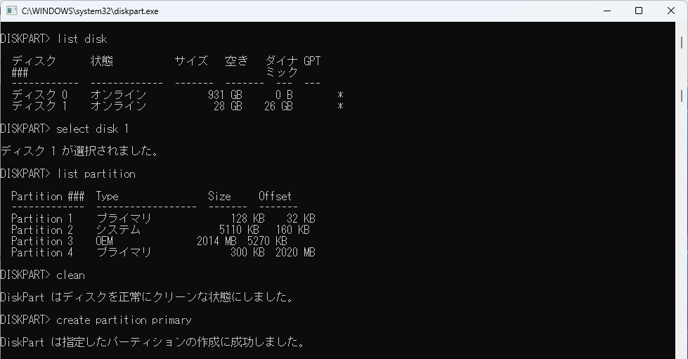 DiskPart はディスクを正常にクリーンな状態にしました。