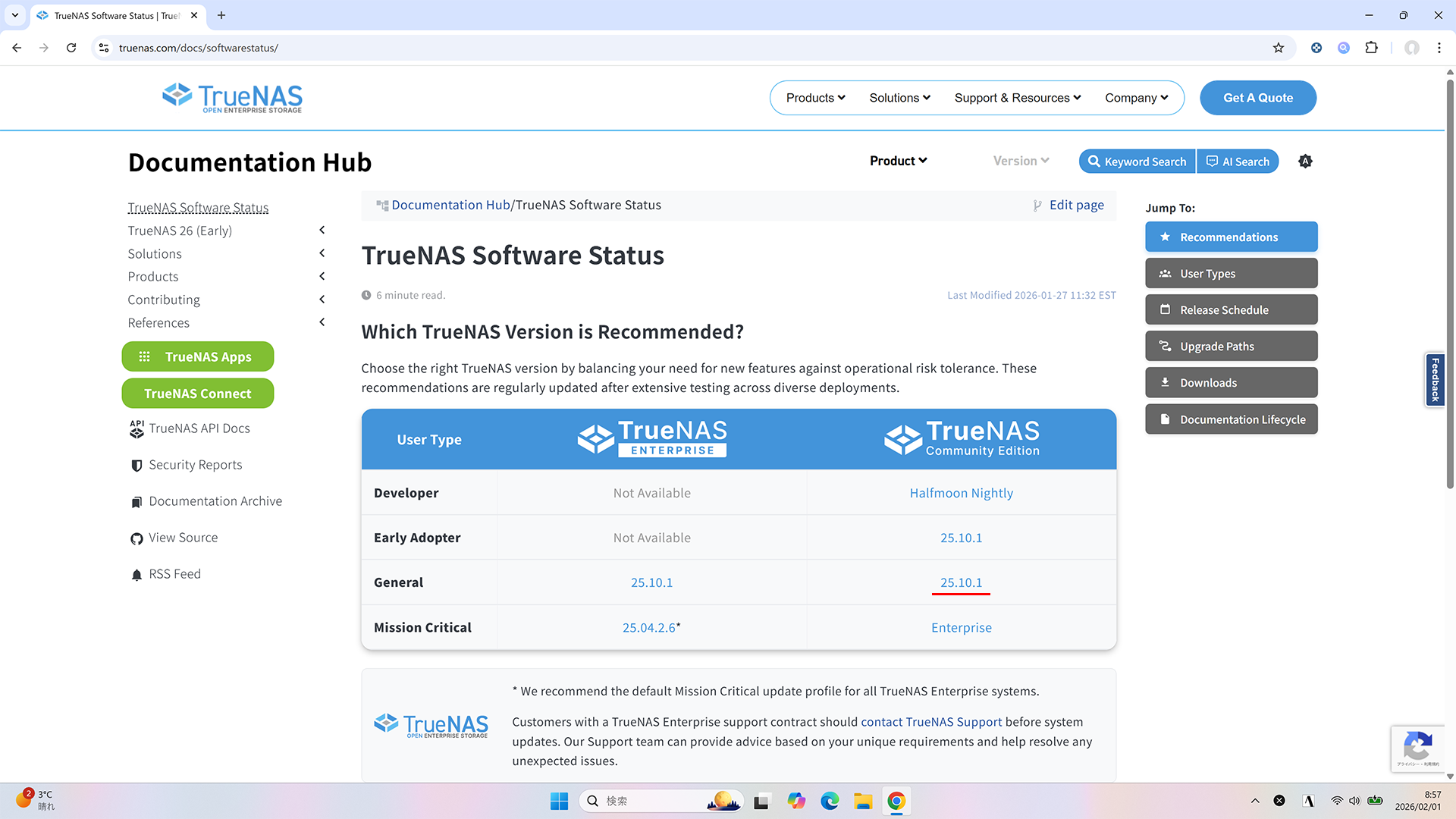 TrueNAS 公式の TrueNAS Software Status で TrueNAS 25.10.1 が General に降りてきていることに気付きました。