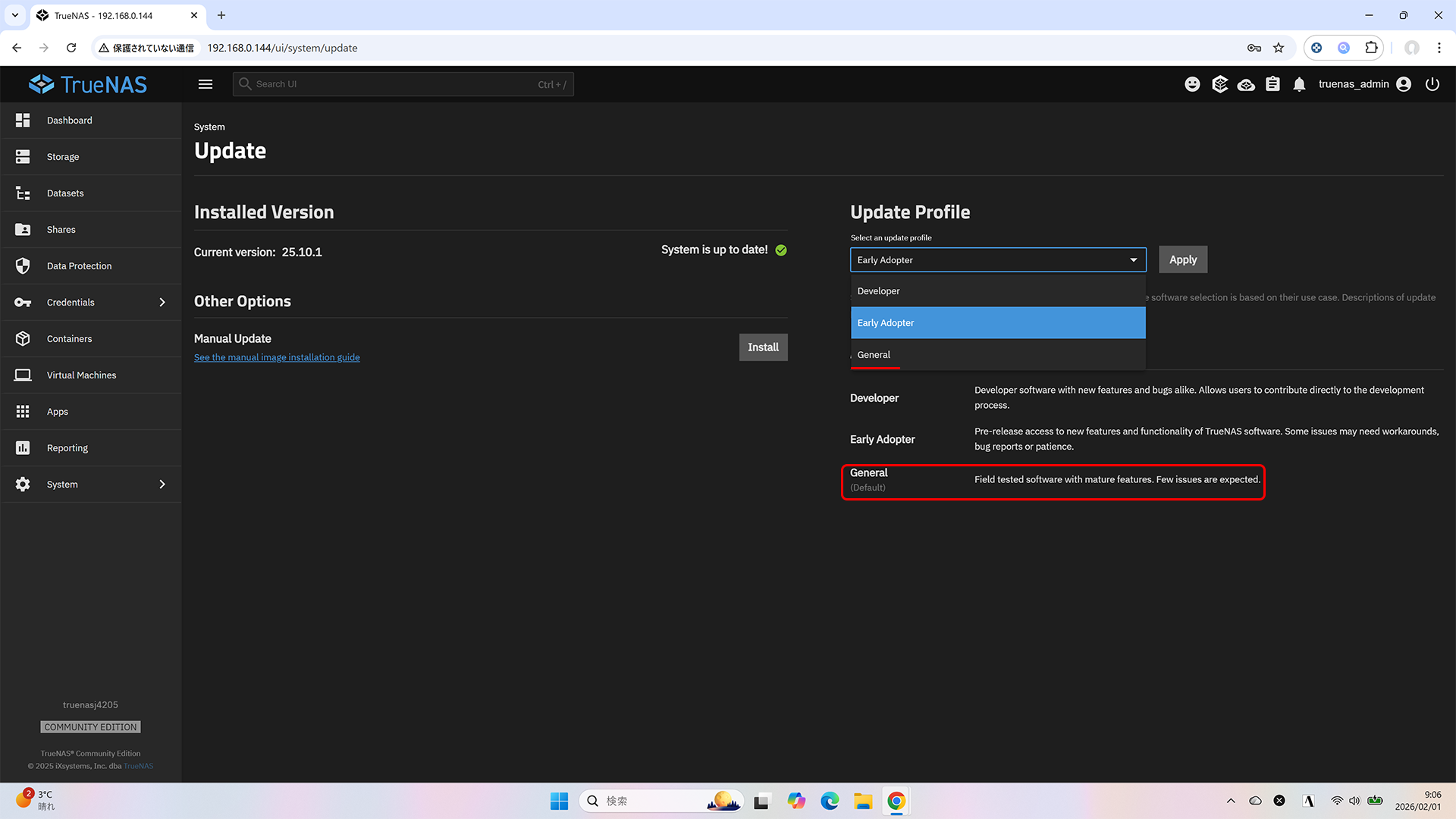 TrueNAS 25.10.0.1 には General の表示はなく、TrueNAS 25.10.1 にアップグレードすると選択肢に出るようになりますが、選択されているのは Early Adopter のままです。