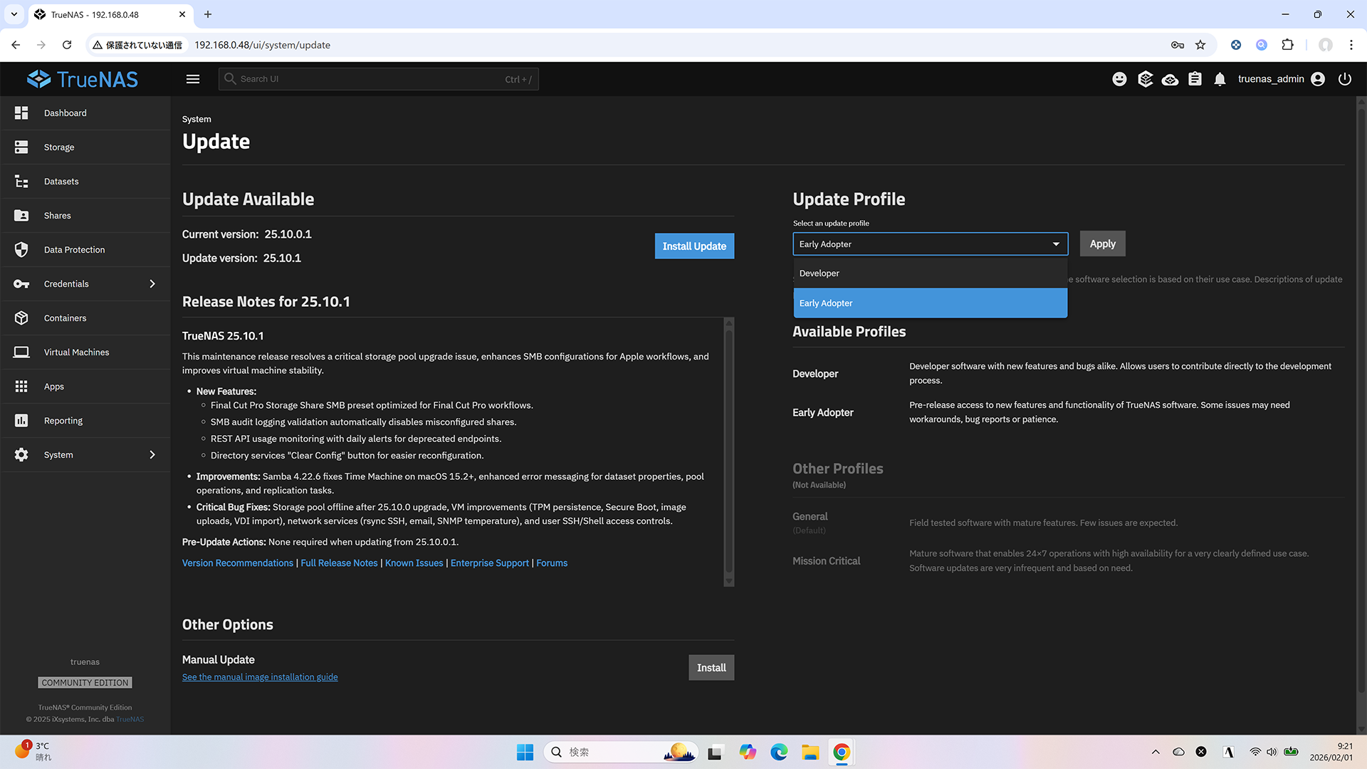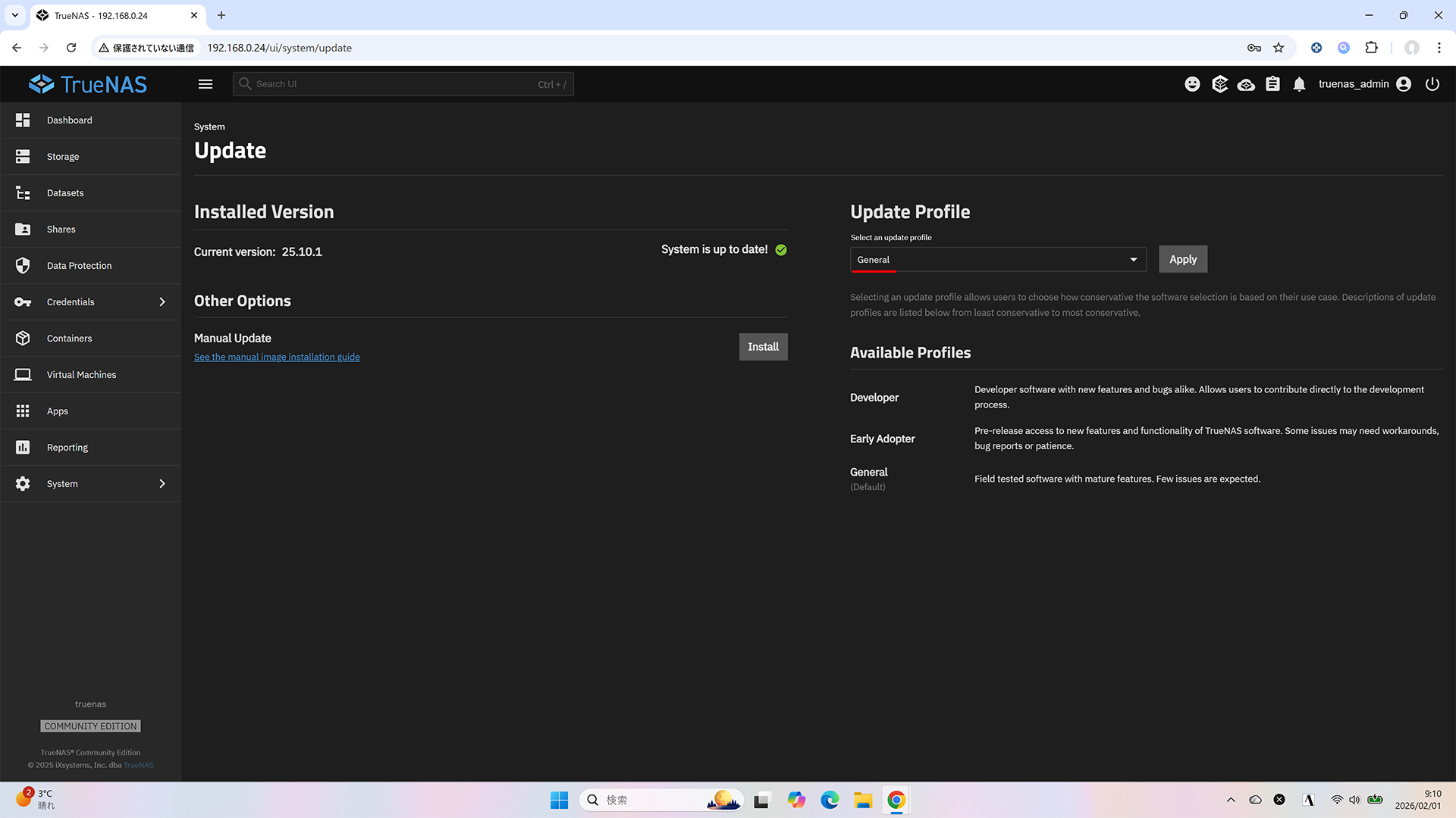 元々稼働している TrueNAS 25.10.1 の Update 画面の Update Profile に General が登場しています。
