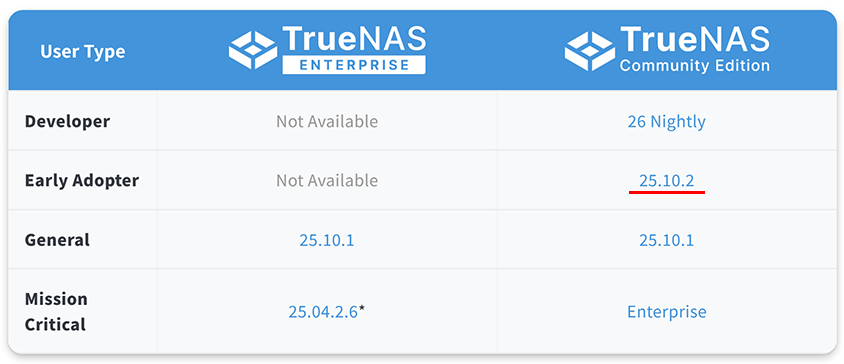 公式の Software Status では、まずは Early Adopter のところだけ 25.10.2 になったようです。