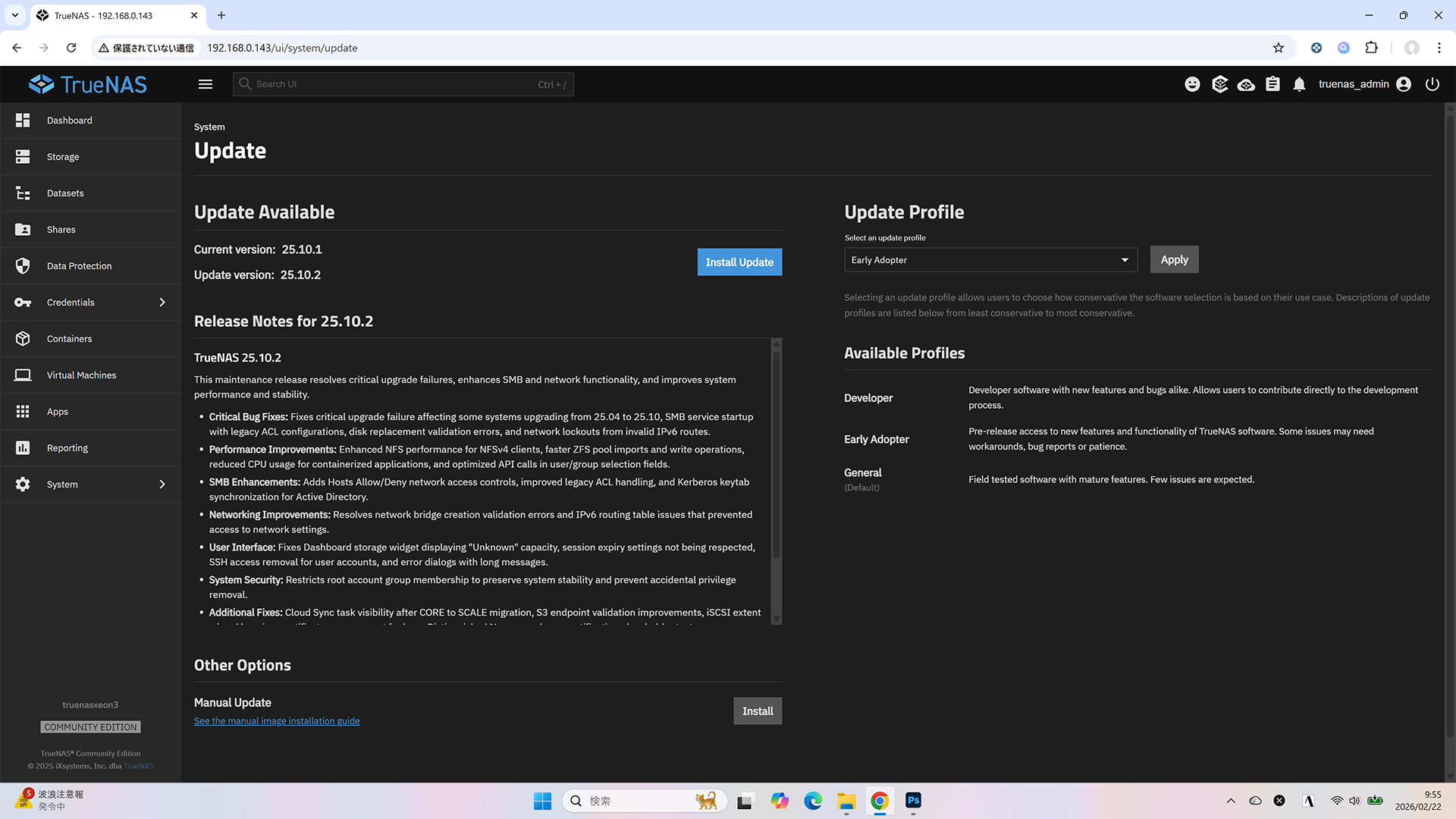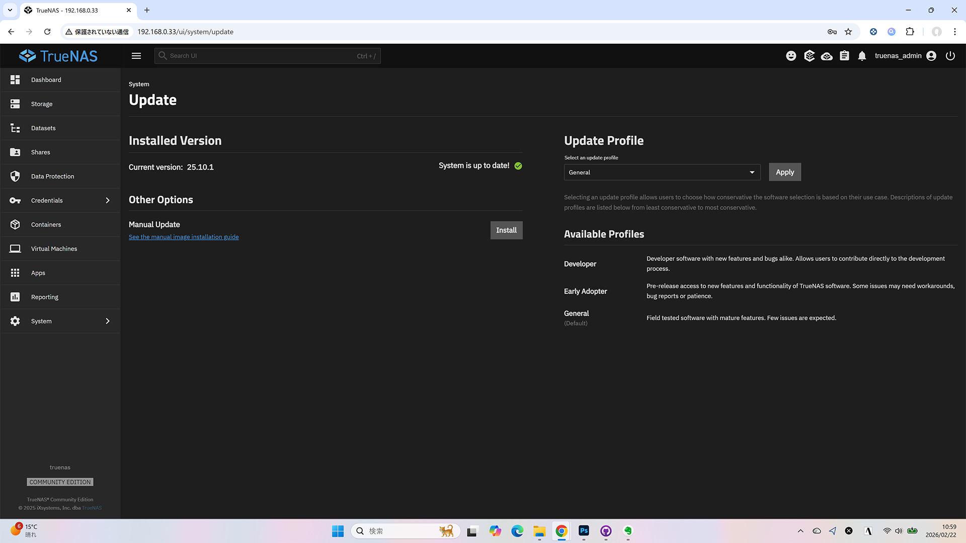TrueNAS 25.10.1 にアップデート後に Update Profile を General に変更していると、