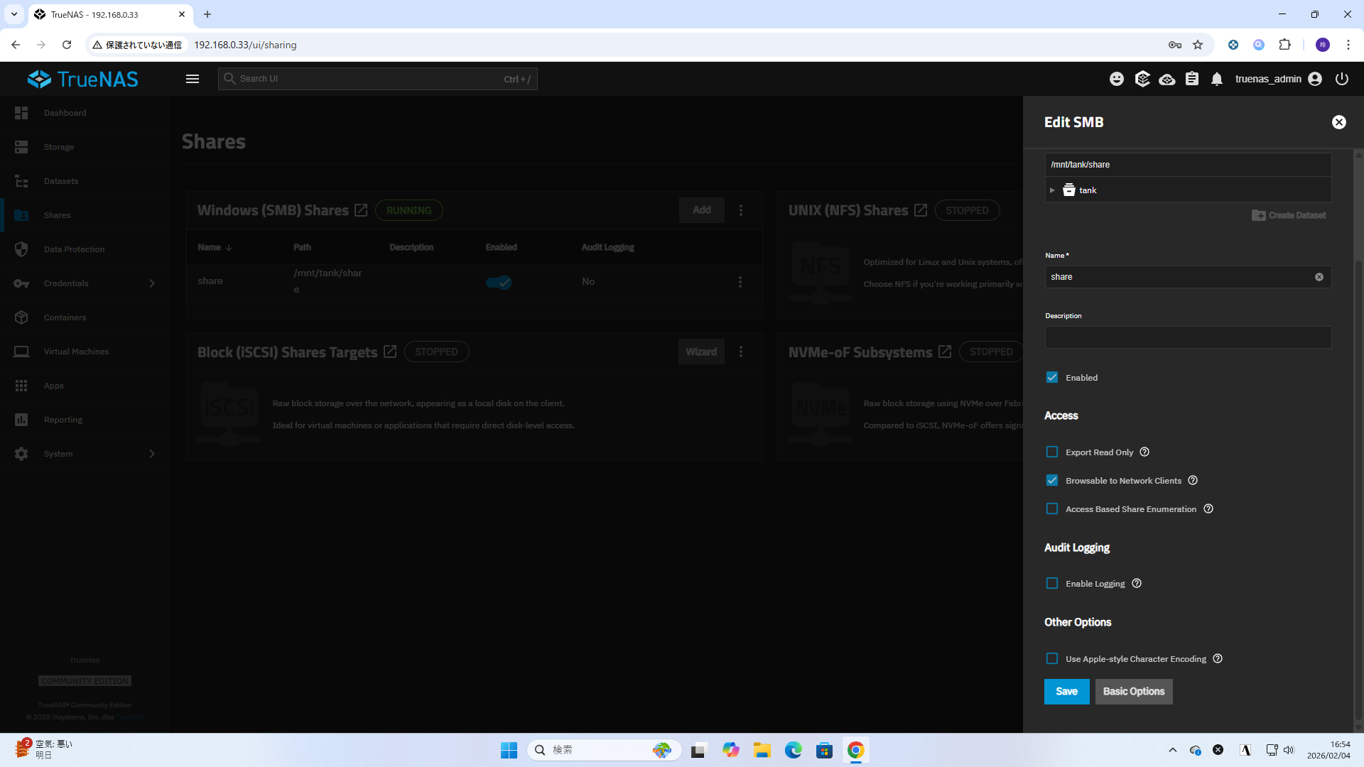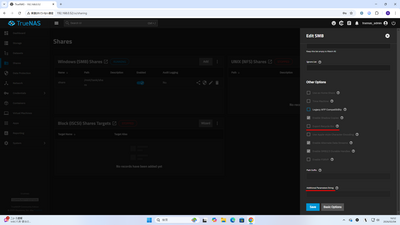 Shares > Windows (SMB) Shares で、共有を作成するとき、 Advanced Options をクリックしても、