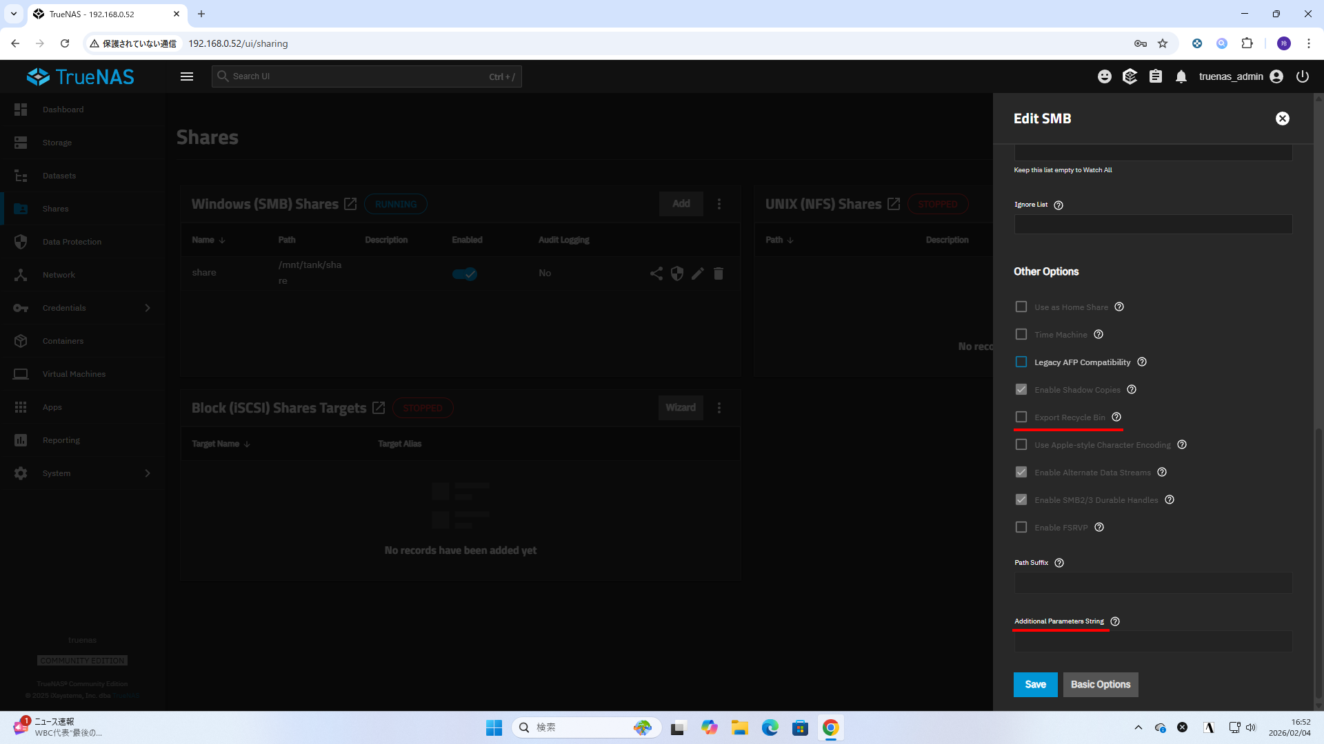 TrueNAS 25.10.1 に Export Recycle Bin(ごみ箱を有効にする)が見当たらないようです。